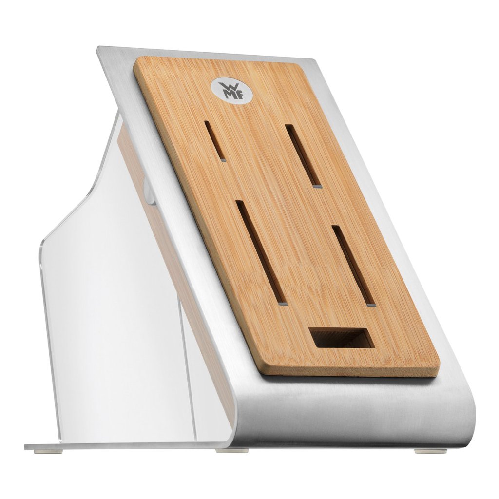 Blok na nože Chef’s Edition společnosti WMF je vyroben z bambusu a ušlechtilé nerezové oceli Cromargan®. Poskytuje místo pro čtyři nože a jedny nůžky. Kombinace bambusového dřeva s nerezovou ocelí odpovídá moderním trendům a zároveň působí nadčasově. Nože jsou díky bloku na nože chráněny před otupením a přitom stále při ruce.