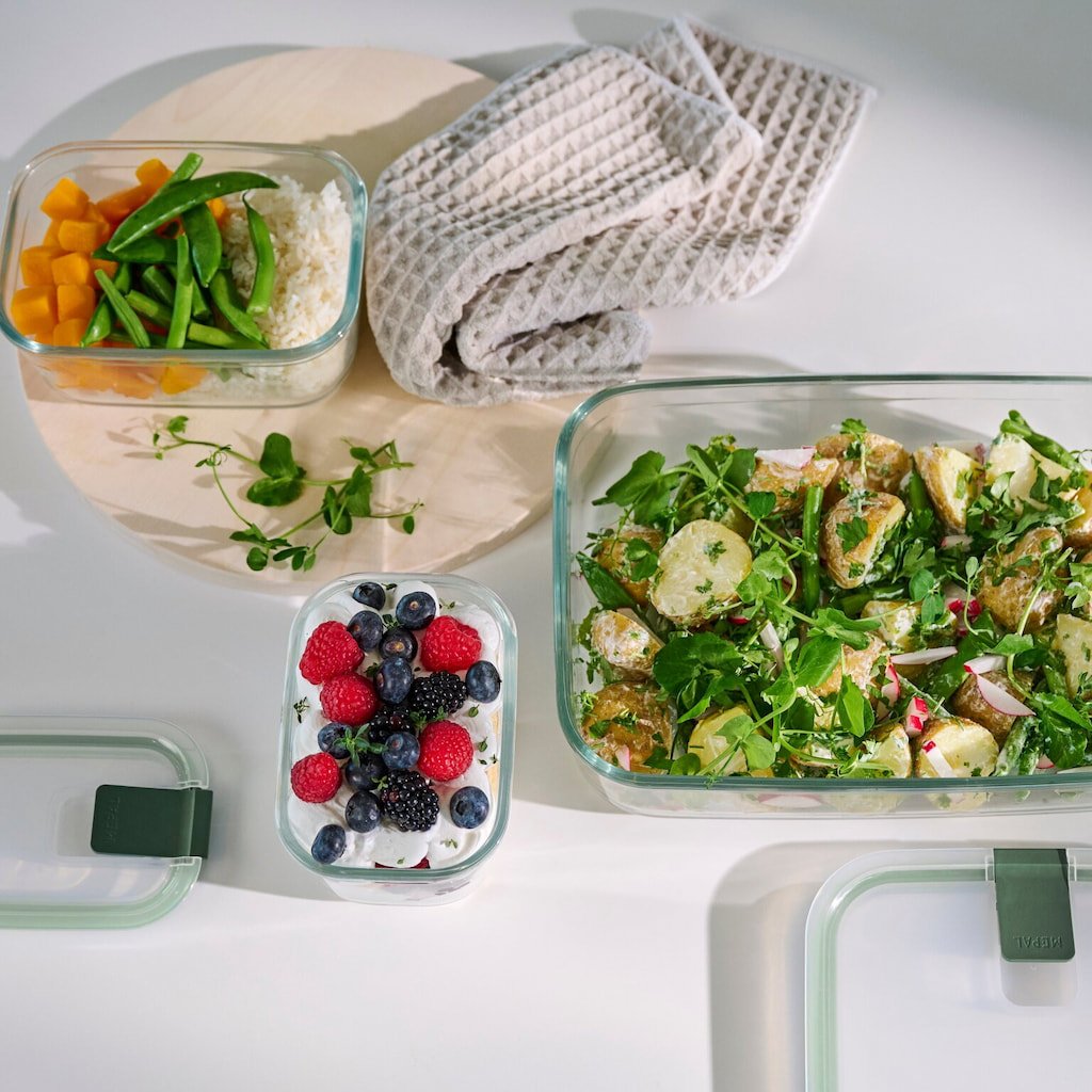- skleněná dóza na potraviny Mepal EASYCLIP o objemu 700 ml je ideální pro přípravu, skladování a servírování jídel v jedné nádobě