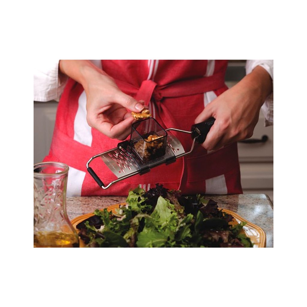 Dvoudílný chránič prstů se zásobníkem z řady Gourmet amerického výrobce Microplane® udrží vaše ruce během strouhání bezpečně izolované od ostrých zoubků struhadel ze stejné série. Slouží i jako zásobník na drobné suroviny, například na ořechy, česnek, muškátový oříšek nebo kus tvrdého sýra, které během práce se struhadlem pevně udržuje přímo u funkční části. Stačí pár snadných rychlých pohybů nahoru a dolů a malá kostička čokolády se promění v úhledné hoblinky. To vše bez vzniku nežádoucích přebytků nezpracovaných ingrediencí a naprosto bez rizika poranění.