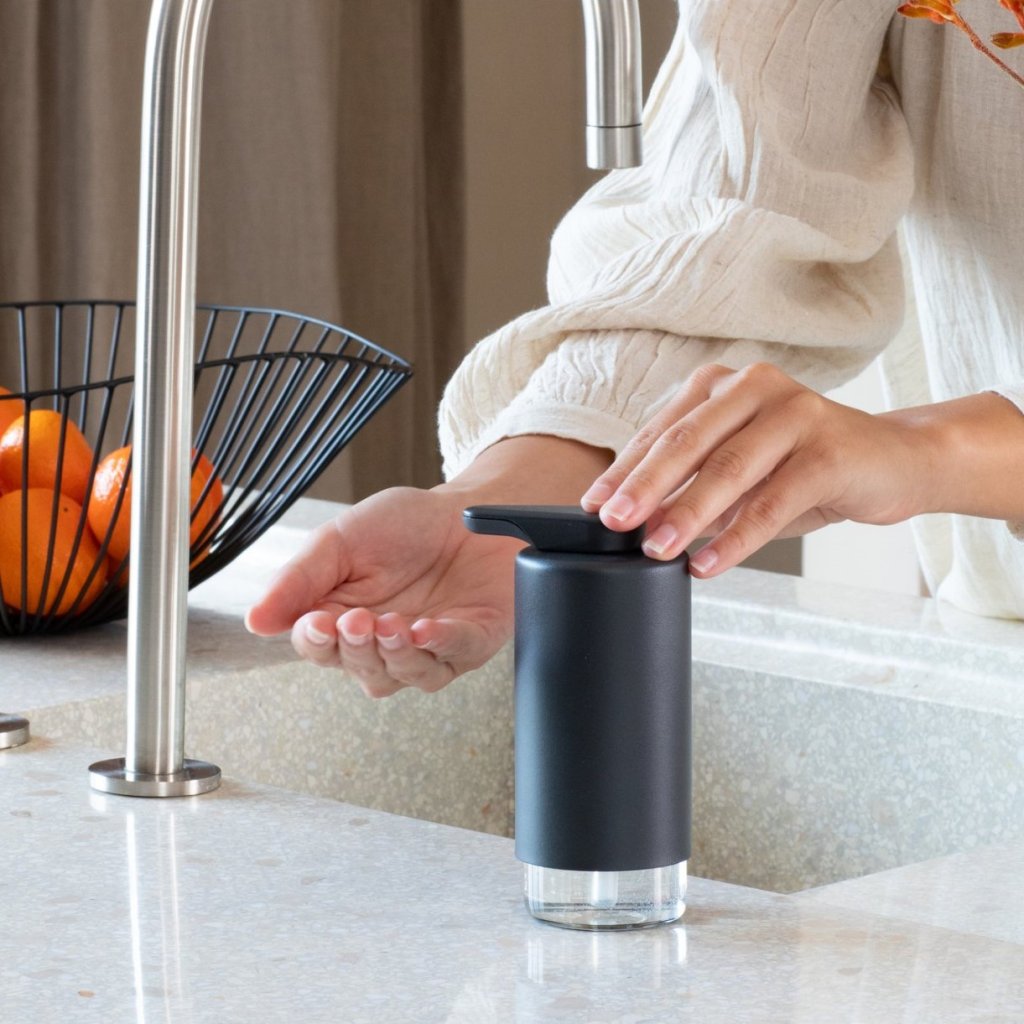 - druhý dávkovač z kovu a skla - design bez ukapávání, moderní kovové provedení s minerálním povlakem, uvnitř se nachází průhledný skleněný zásobník na mýdlo