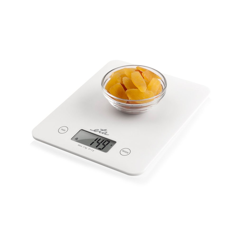 Kuchyňská váha ETA Lori v bílém provedení je vybavena vážicí plochou z odolného plastu, který se snadno čistí, a maximálním zatížením až 5 kg. Díky funkci TARE umožňuje postupné dovažování, odečtení hmotnosti nádoby i vložených surovin. Výhodou je vážení s přesností na 1 gram i volba jednotek (g:kg, lb:oz, ml:voda, ml:mléko, fl´oz:voda, fl´oz:mléko). Nesmíme zapomenout na přehledný LCD displej i funkci automatického vypnutí - váha se sama vypne po 2 minutách nečinnosti. Je skladná a má protiskluzové nožičky, které zajišťují maximální stabilitu na pracovní ploše.