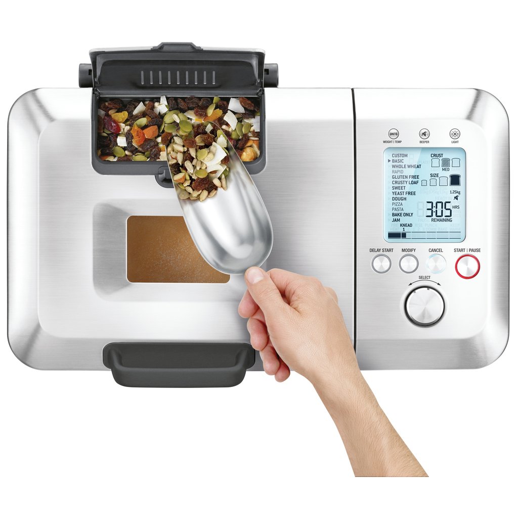 Inteligentní domácí pekárna na chléb BBM800BSS Smart od výrobce Sage upeče chléb za vás v době, kterou si určíte. Sama přidá oříšky nebo sušené ovoce v tu správnou chvíli. Unikátní hnětací hák, který se před koncem pečení složí, aby v chlebu nevznikl otvor, vypracuje těsto tak, že váš domácí chléb bude vždy vypadat dokonale. Pekárna na chleba je opatřena velkým modře podsvíceným LCD displejem. Je zde 60minutová ochrana proti přerušení napájení. Díky tomu se pekárna při výpadku elektrického proudu po obnově znovu zapne a pokračuje dál v pečení.