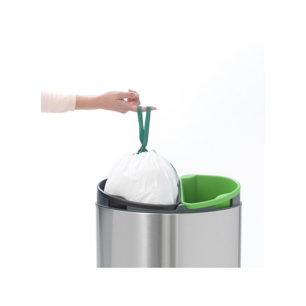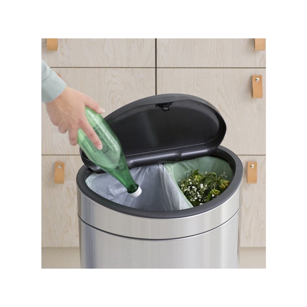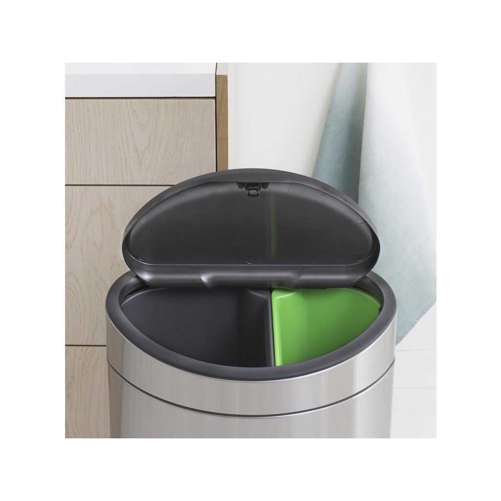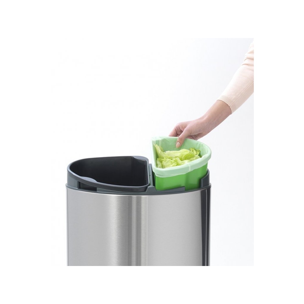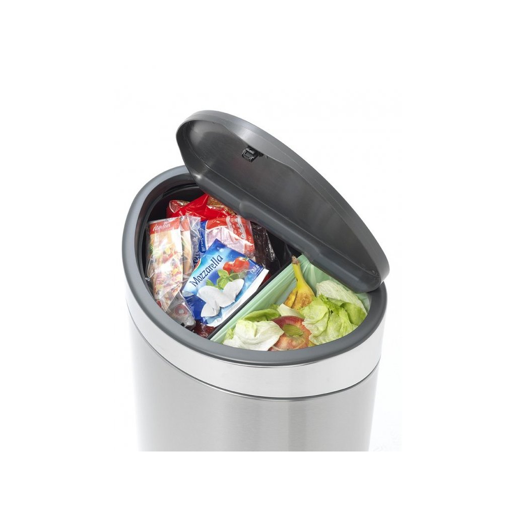 Dotykový odpadkový koš o objemu 33 litrů nabízí řešení pro funkční a jednoduché třídění odpadu. Obsahuje dvě plastová vědra – 23 litrové pro denní odpad a 10 litrové pro kompostovatelný odpad. Jedinečný uzávěr Soft-Touch umožňuje snadné otevírání a zavírání jednou rukou. Speciální ventilační otvory proti vzniku přetlaku během vyndavání plného sáčku