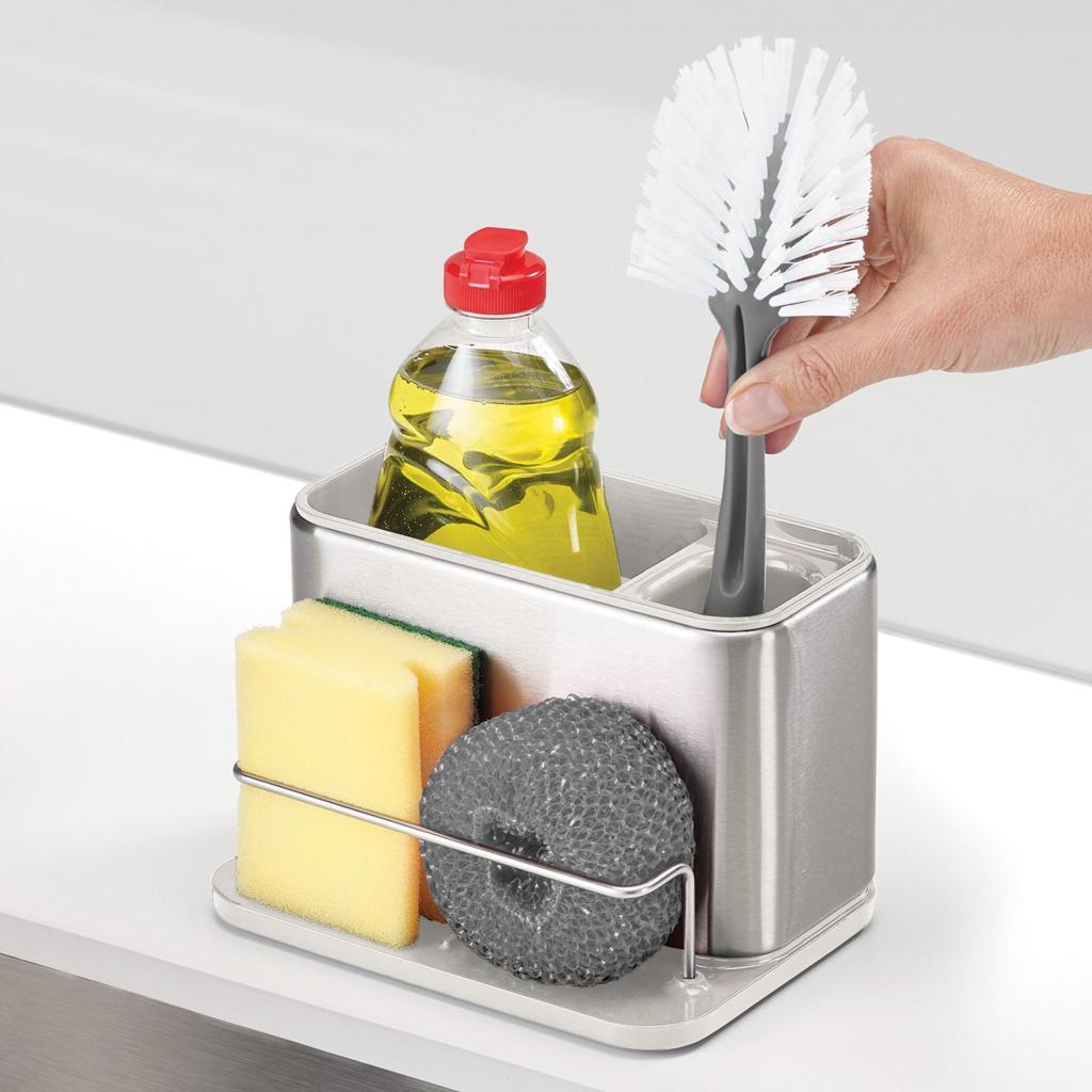 Jsou chvíle, kdy si u dřezu připadáte jako v malé laboratoři plné houbiček, kartáčků a lahviček, které si navzájem překážejí. Tento nerezový organizér jim dá jasný řád a oddělí jednotlivé pomůcky tak, že každá má své místo. Místo improvizace tak přichází jednoduchý systém, který funguje každý den.