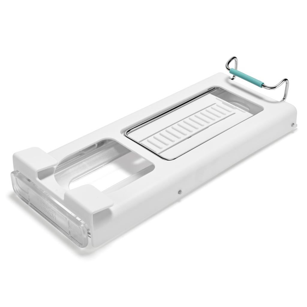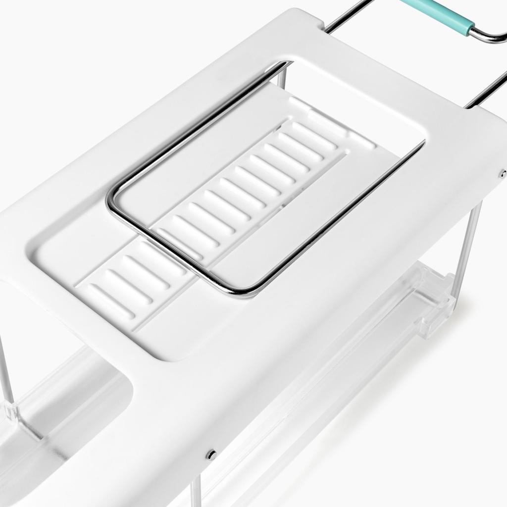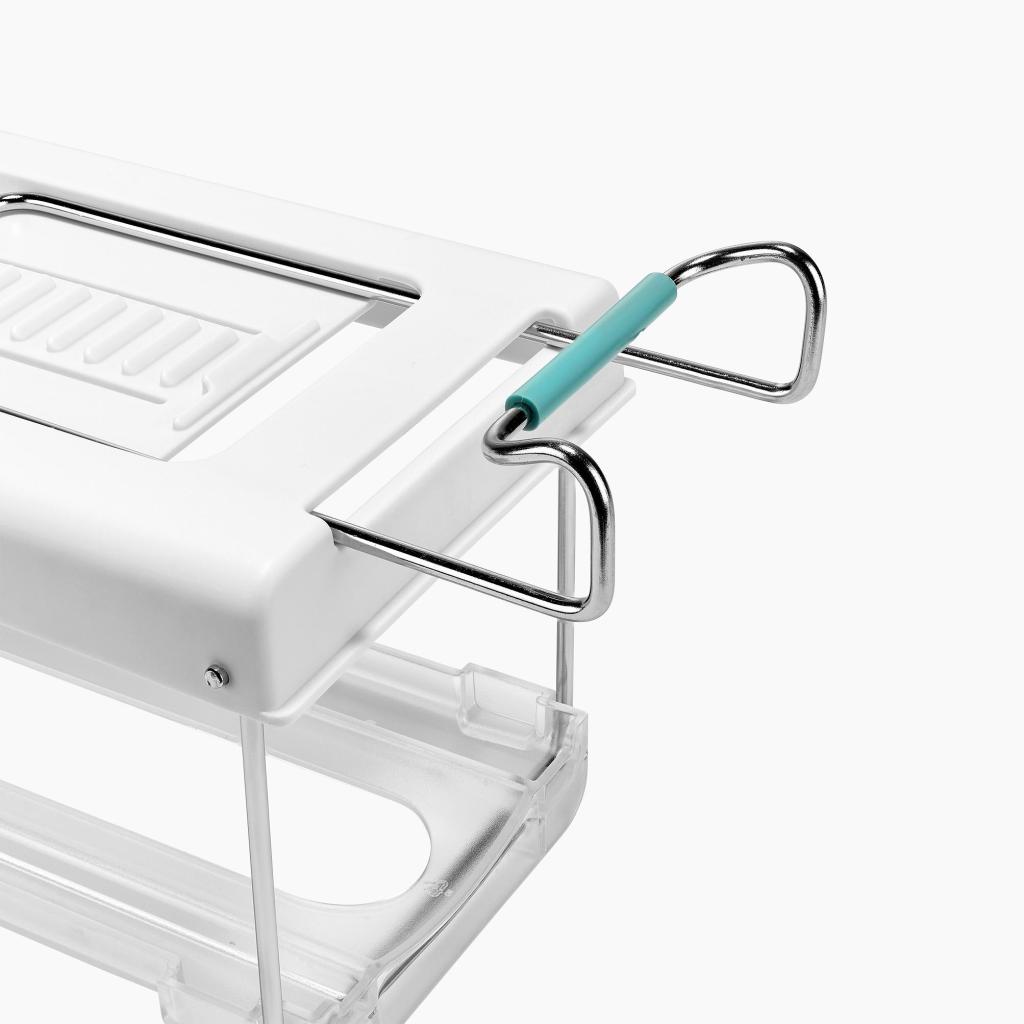 - Držák se snadno a pevně upevňuje přímo pod polici lednice, takže využívá dosud nevyužitý prostor a pomáhá udržet vnitřek chladničky dokonale organizovaný.