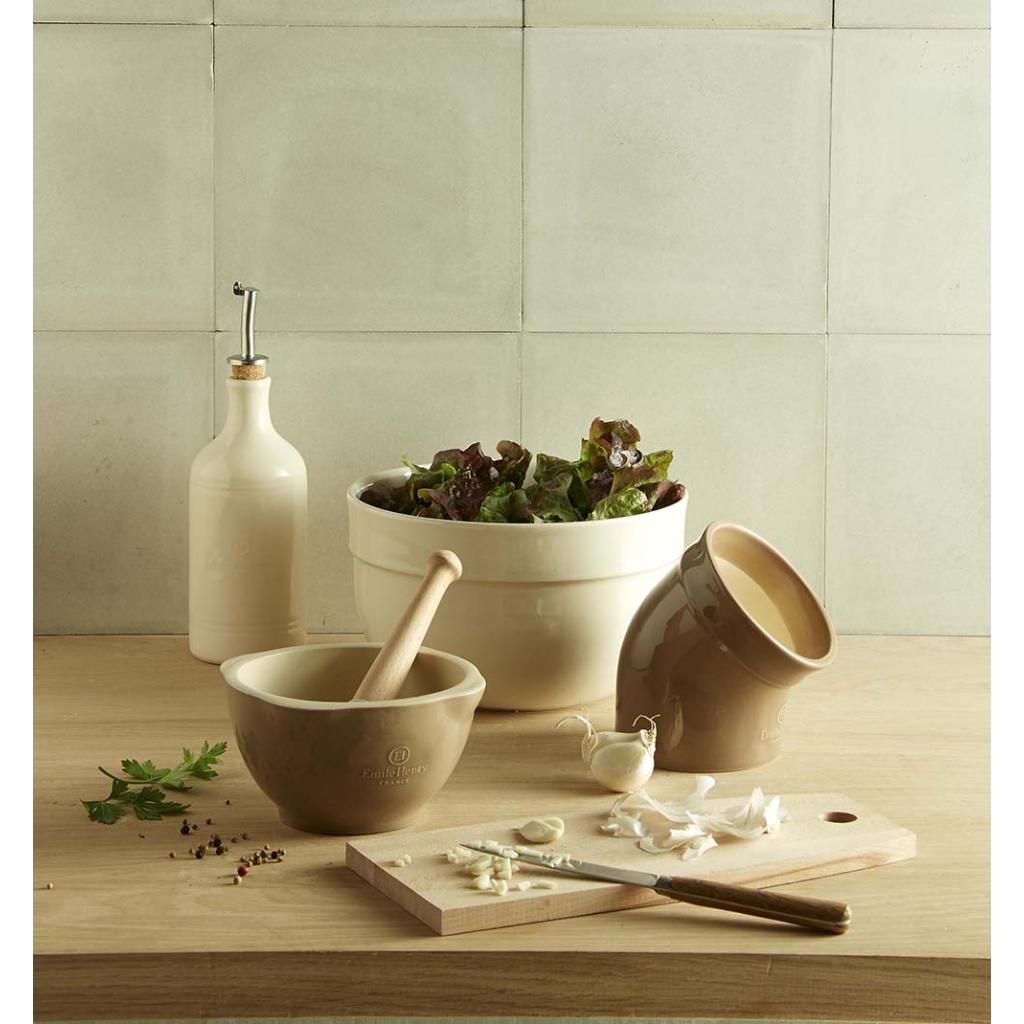 Keramický hmoždíř a palička ze dřeva s keramickou hlavou. Vnitřní speciální glazura zajišťuje, aby ingredience z hmoždíře nevyšplouchly ven. Je pachově a chuťově neutrální. Hmoždíř je neocenitelný pomocník při výrobě marinád, kořenících směsí či omáček.