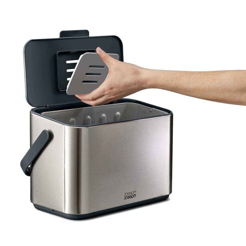 - Pod vnitřní nádobou se nachází praktický prostor pro uložení balení sáčků Joseph Joseph IW2 na míru, které tak máte vždy po ruce.