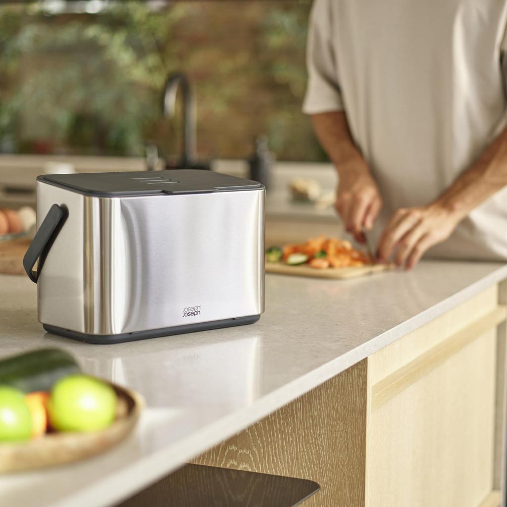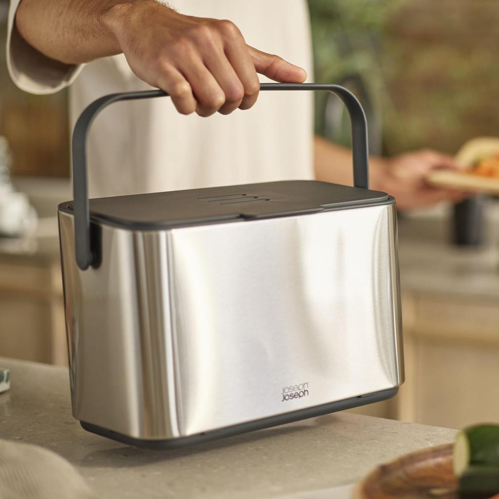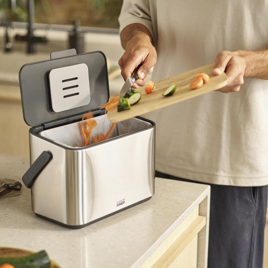 - Kapacita 4 litry a kompatibilita se sáčky Joseph Joseph IW2 na míru zajišťují pohodlné používání a efektivní nakládání s bioodpadem.