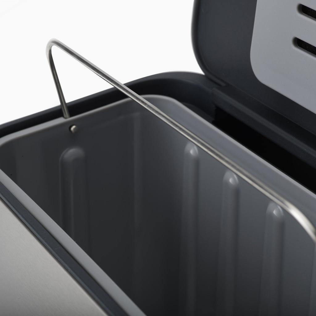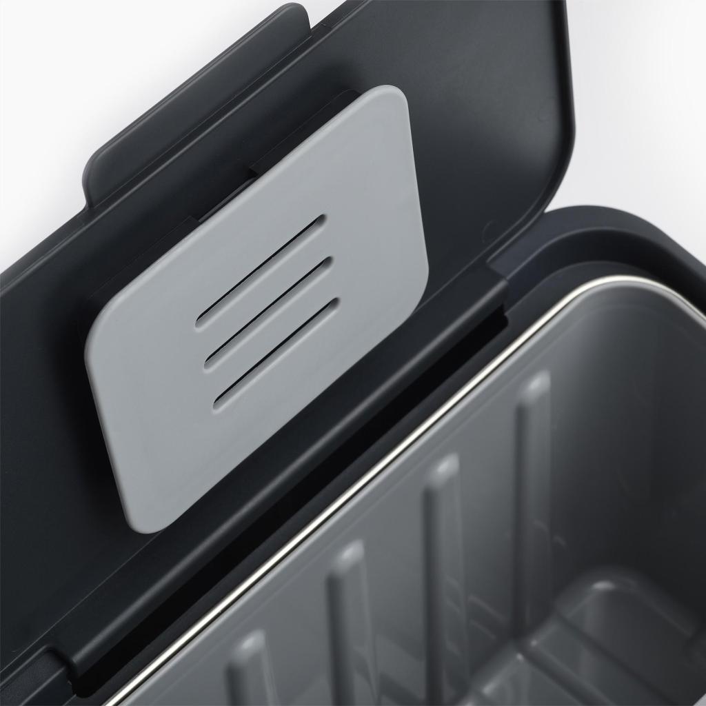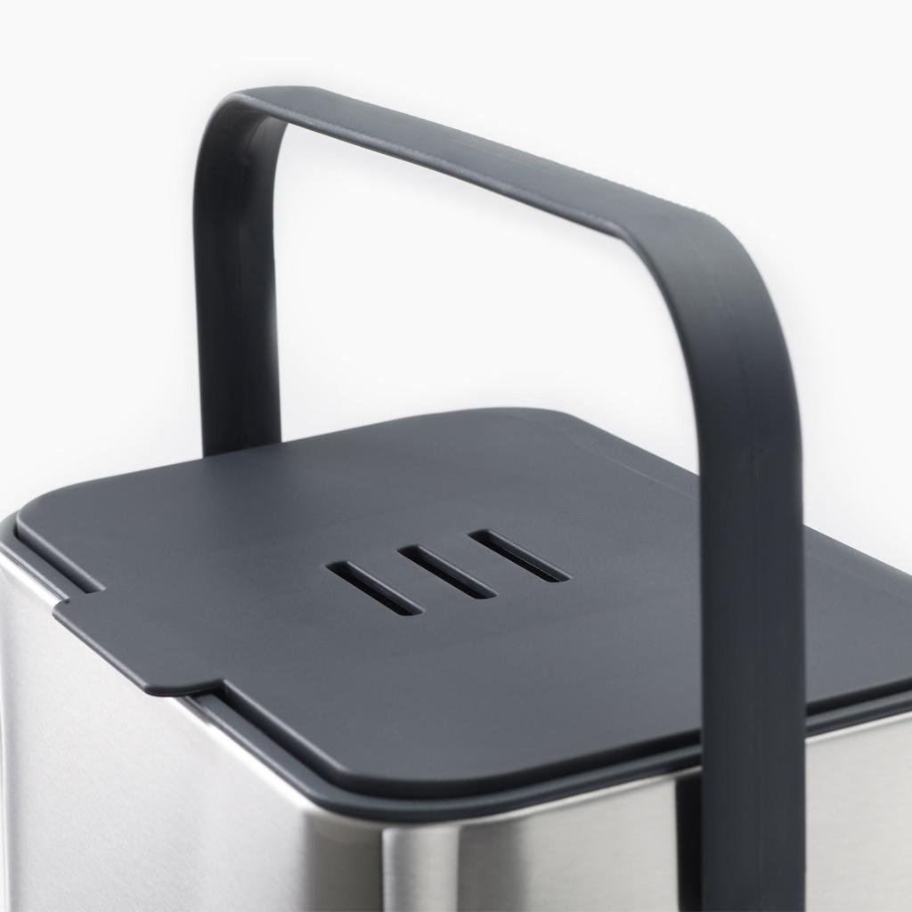 - Vyjímatelná vnitřní nádoba umožňuje snadné a hygienické vysypání obsahu do venkovního kompostéru nebo většího koše.