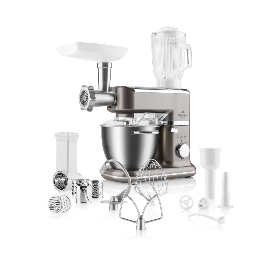 Multifunkční kuchyňský robot ETA Gratussino Bravo II a jeho výkonný 800 W motor se stabilizátorem šlehá, míchá i hněte těsto či pomazánky, nastrouhá zeleninu či ořechy, namele maso, naplní uzeniny, připraví masové kuličky Kebbe, umixuje smoothie nebo polévku a mnoho dalšího.