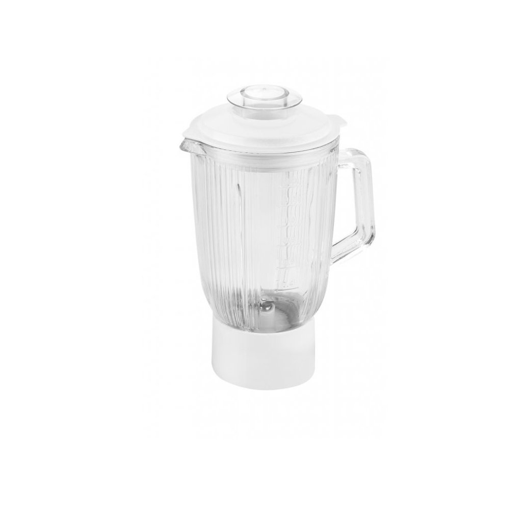 Skleněný mixér, který je součástí balení, má nerezové mixovací nože a otvor ve víku pro plnění tekutin za chodu.