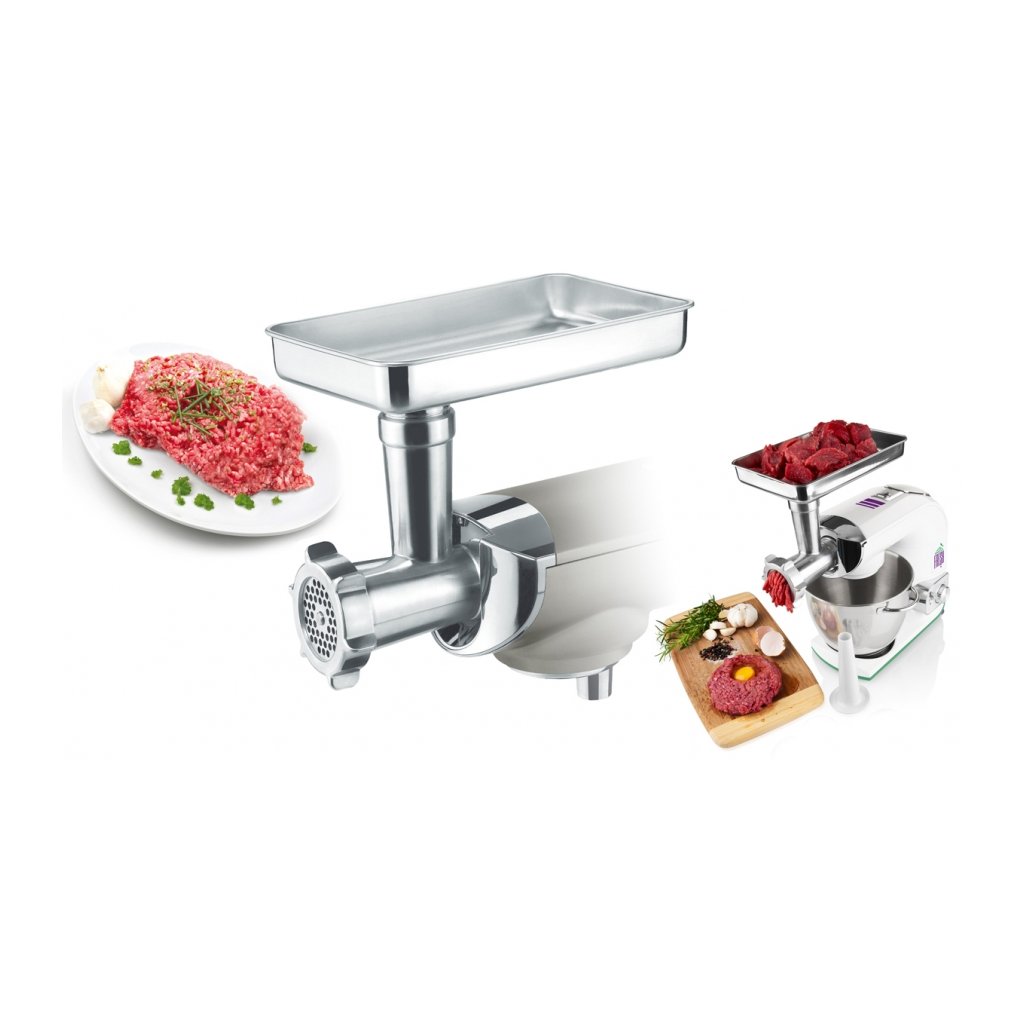 Mlýnek na maso je vhodný pro zpracování jakéhokoli druhu masa včetně ryb. Disponuje kvalitním, ostrým a tvrdým nožem, kovovým šnekovým podavačem s vysokou odolností proti opotřebení, kovovou mlecí komorou a velkou nerezovou násypkou. Tři ocelové destičky vám umožňují vybrat si tu správnou hrubost mletí. Pro bezpečnou práci je k dispozici plastové pěchovadlo.