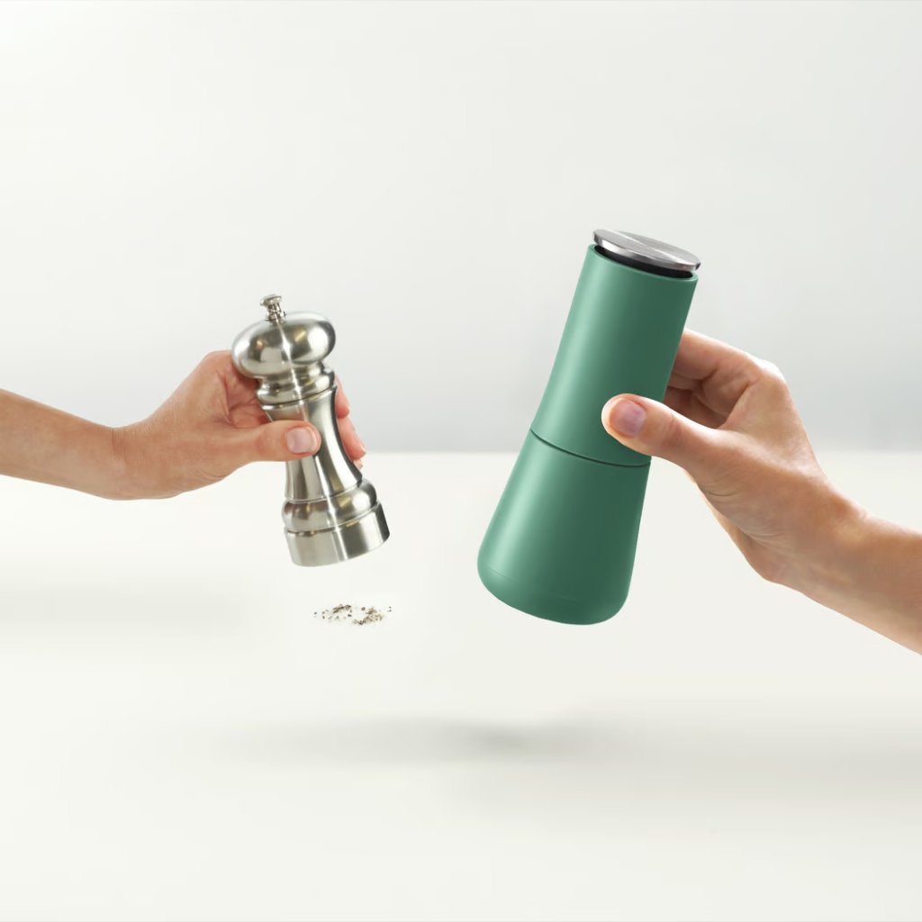 - sada mlýnků má unikátní design, který eliminuje nepořádek na stole tím, že mlecí mechanismus je umístěn nahoře