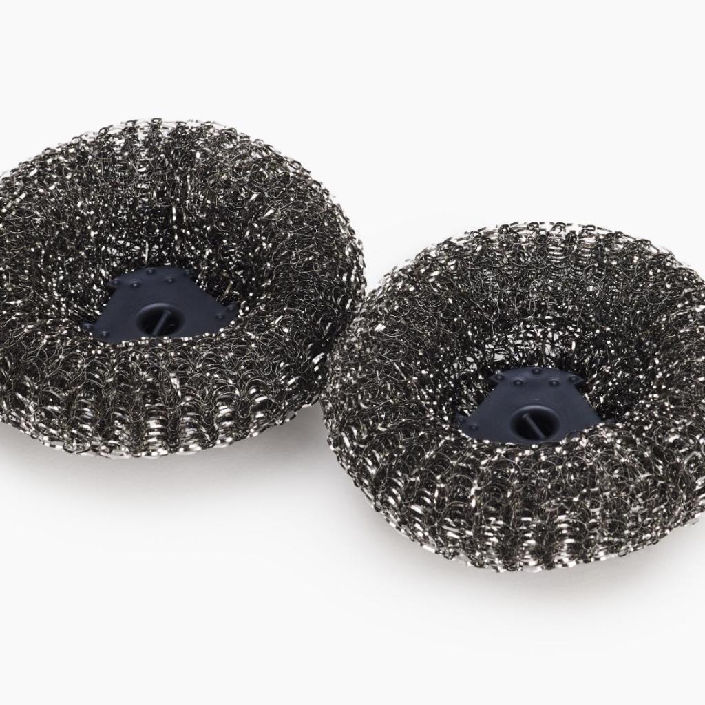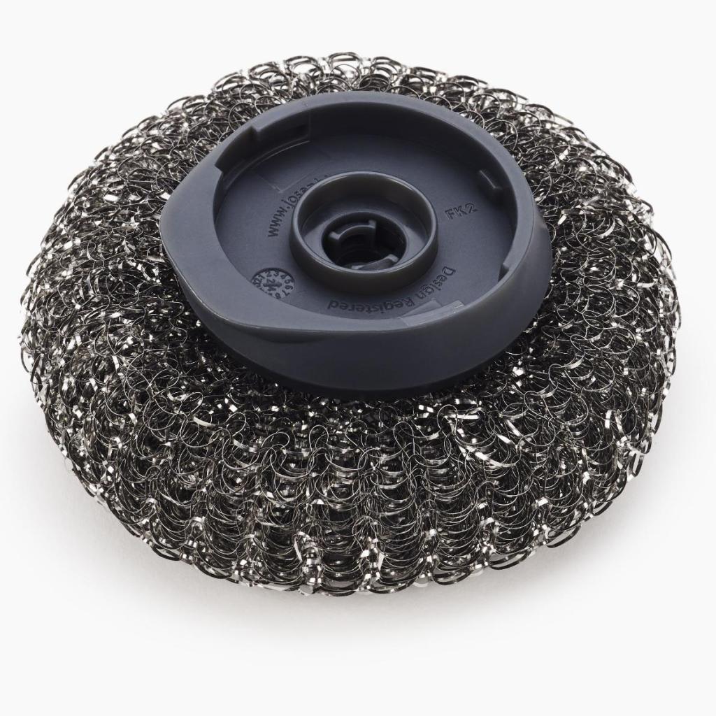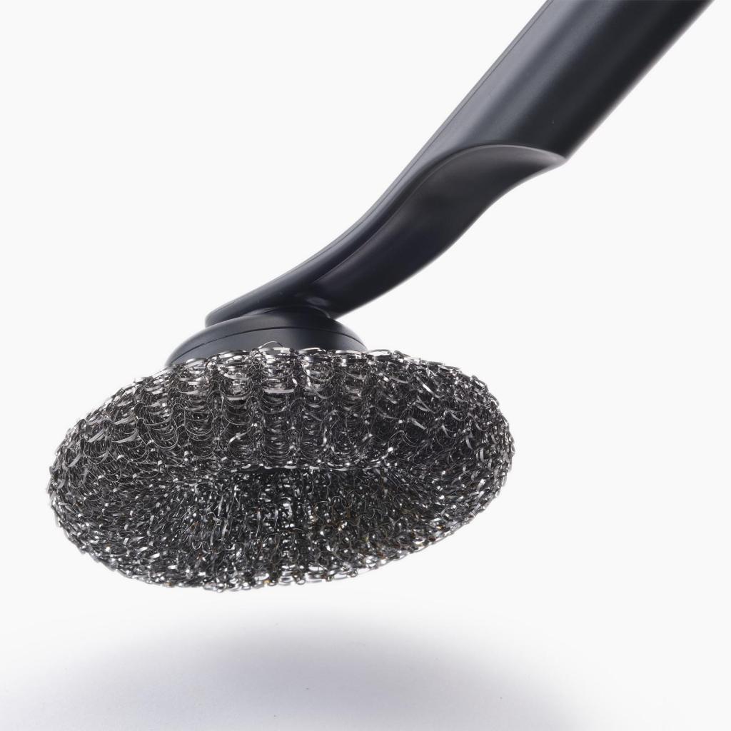 - Konstrukce z nerezové oceli poskytuje vysokou abrazivní účinnost při odstraňování připálených zbytků jídla.