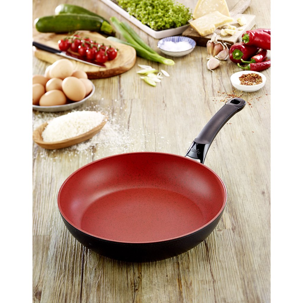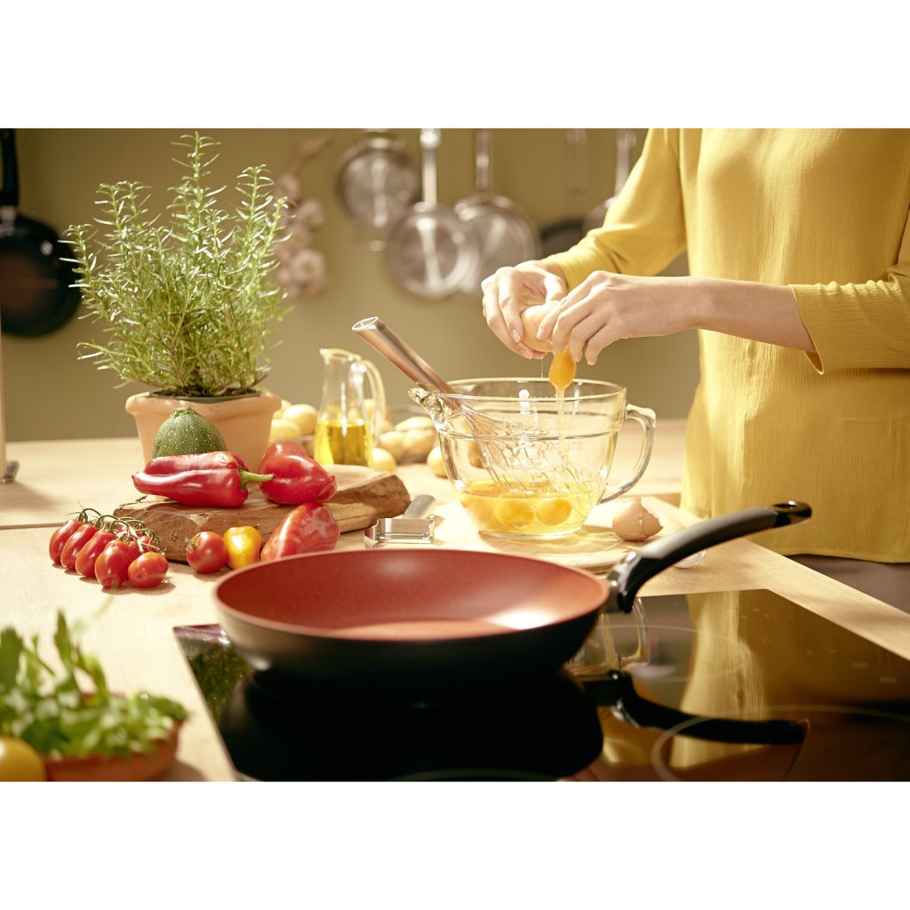 Nově vylepšená ergonomická rukojeť s otvorem na zavěšení zůstává chladná po celou dobu vaření a bezpečně padne do ruky. Vnitřní speciální termo-senzitivní povrch je dokonale nepřilnavý a odolný proti poškrábání. Pánev je vhodná pro zdravé a jemné smažení a opékání při nižších teplotách, s malým množstvím tuku. Díky indikaci optimální teploty pro smažení a restování vždy připravíte skvělé a chutné pokrmy.