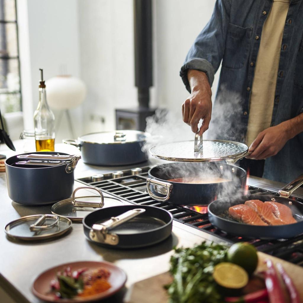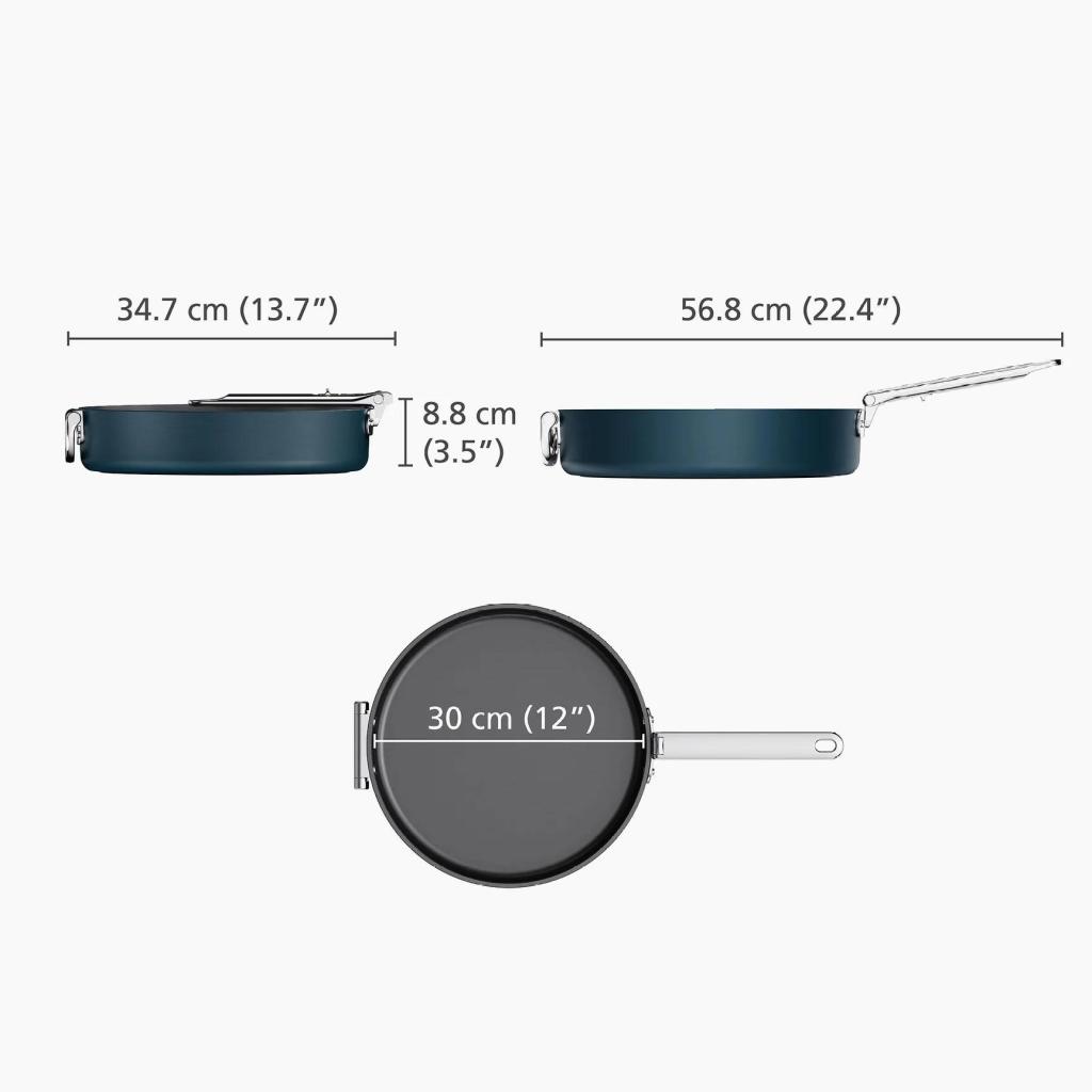 - Díky skládacímu mechanismu lze pánev snadno stohovat s dalšími kusy nádobí, což výrazně usnadňuje přehledné uspořádání kuchyňských skříněk.
