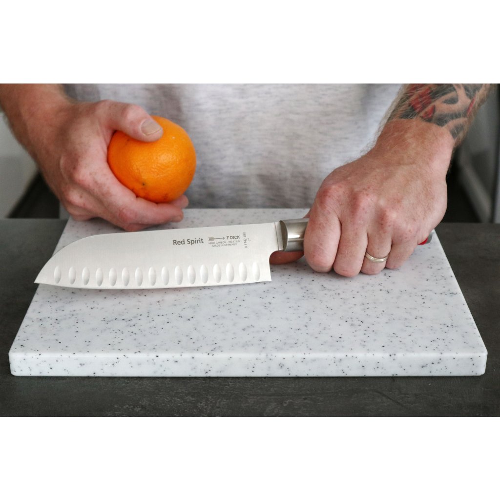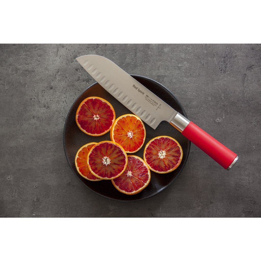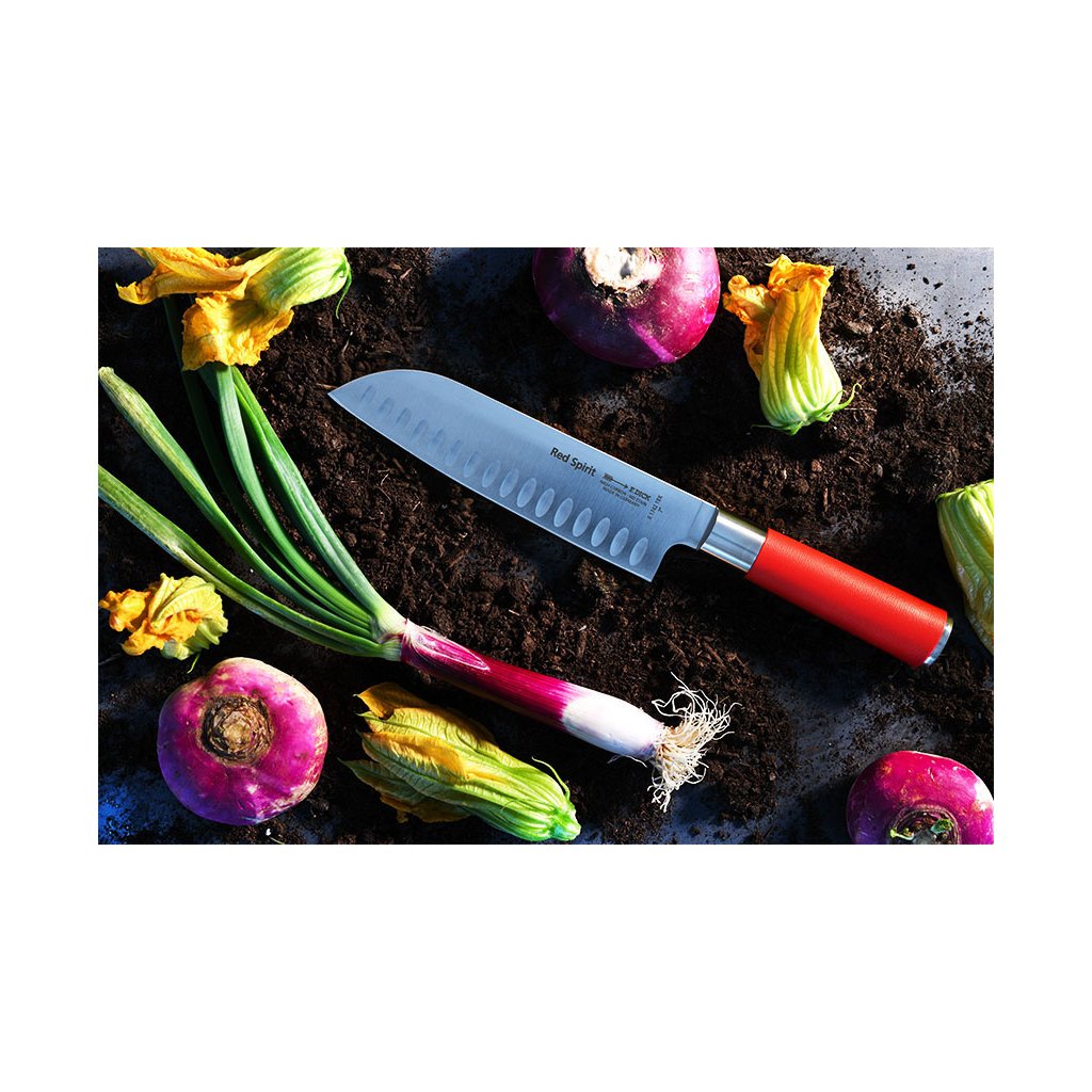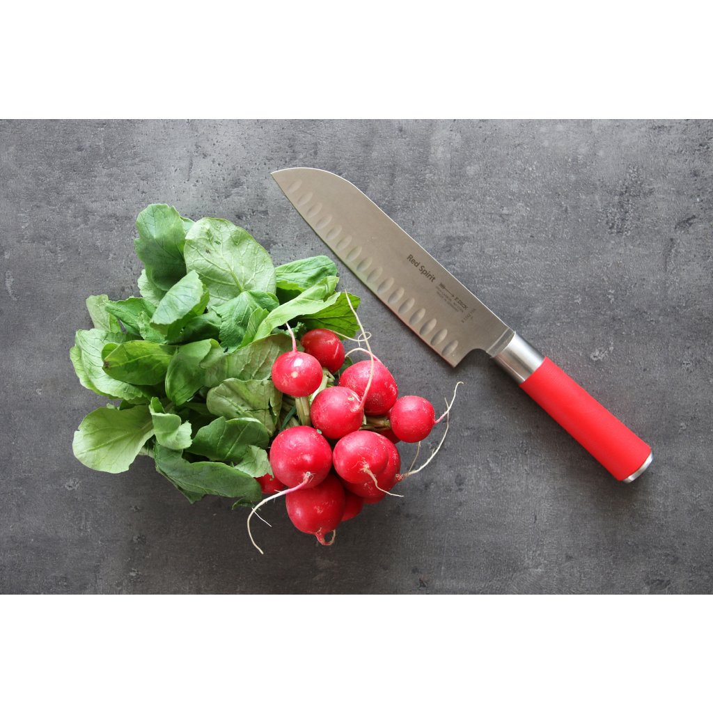 Santoku se speciálním výbrusem Dick ze série RED SPIRIT v délce 18 cm. Používá se na krájení zeleniny, ovoce, masa i bylinek. V kuchyni je univerzálním pomocníkem. Díky speciálnímu výbrusu krájený produkt neulpívá na noži. Široká plocha nože umožňuje nakrájenou zeleninu rovnou nabrat na čepel nože a vložit do pánve nebo hrnce.