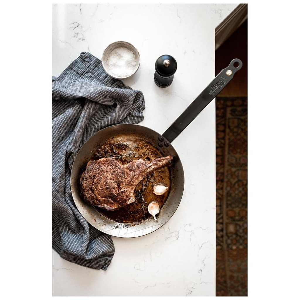 Ocelová pánev na steaky Mineral B je vyrobena v rustikálním designu odkazujícím na ručně kované pánve. Je opatřena rozšířenými okraji a jemnými rýhami na vnitřní straně, jež vytvářejí pravidelný vzor. Francouzská společnost de Buyer, jež pánev vyrábí, je celosvětově uznávaná především v profesionální sféře, kde jsou ocelové pánve velmi oblíbené pro jejich nenahraditelné vlastnosti při restování masa či zeleniny.