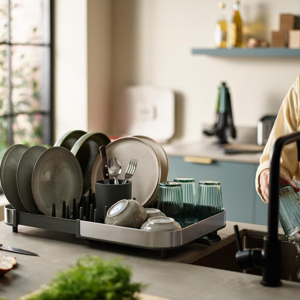 - Díky chytrému výsuvnému mechanismu snadno zvětšíte odkapávací plochu téměř na dvojnásobek, takže bez potíží usušíte i větší množství talířů, hrnků a sklenic po rodinném obědě.
