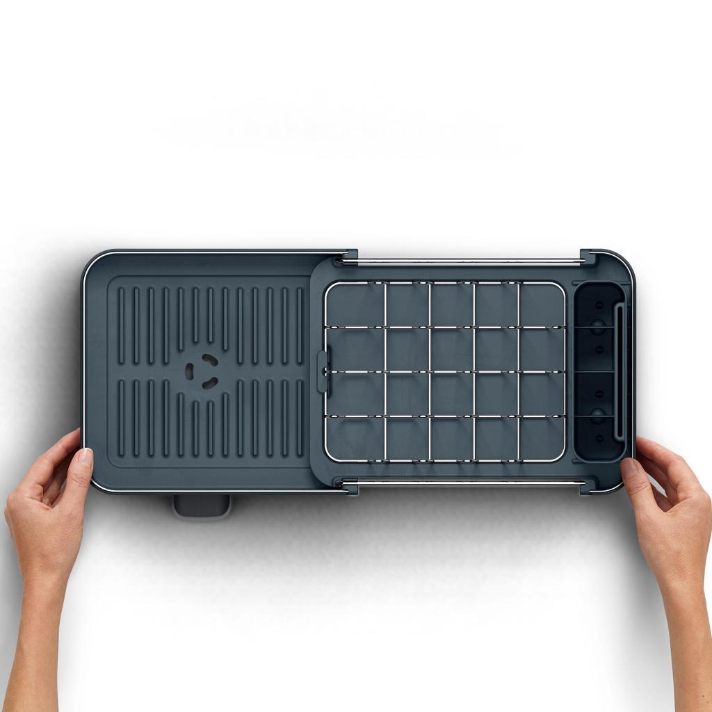 - Rozšiřitelná konstrukce umožňuje jednoduchým vysunutím zvětšit odkapávací plochu, takže při větším množství nádobí získáte okamžitě více místa pro talíře, sklenice nebo misky.