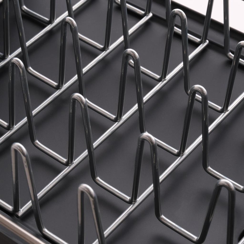 - Kovové držáky na talíře pomáhají udržet nádobí stabilně na místě a zároveň umožňují efektivní proudění vzduchu při sušení.