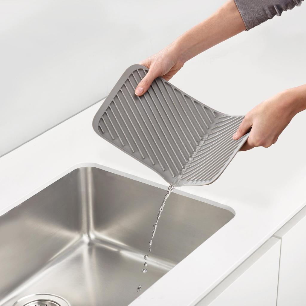 - Nahromaděnou vodu snadno odstraníte uchopením podložky za protilehlé rohy a jejím přirozeným ohnutím směrem ke dřezu.