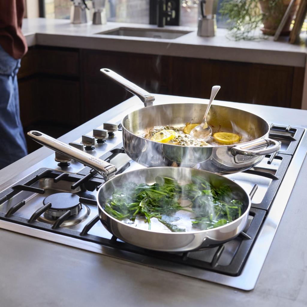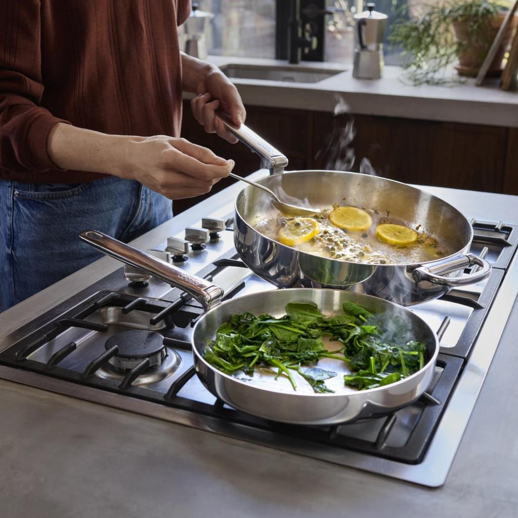 - Robustní třívrstvá konstrukce kombinuje leštěný vnější nerezový povrch, hliníkové jádro pro rovnoměrnou distribuci tepla a vnitřní matný nerezový povrch.