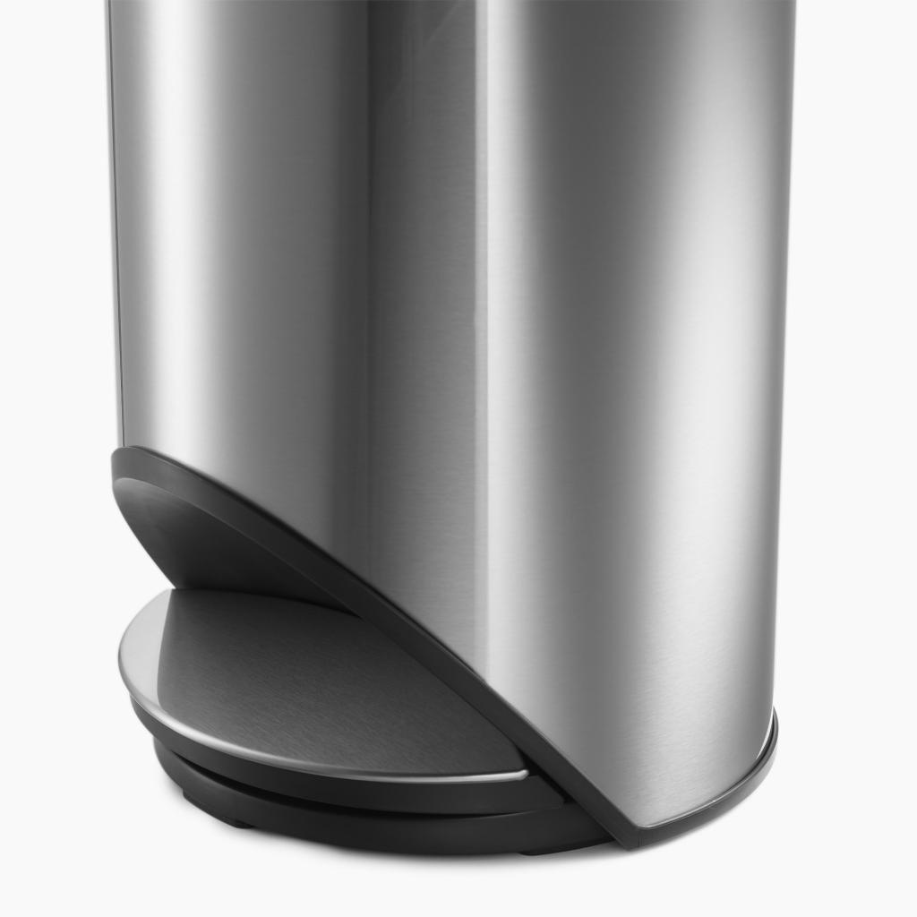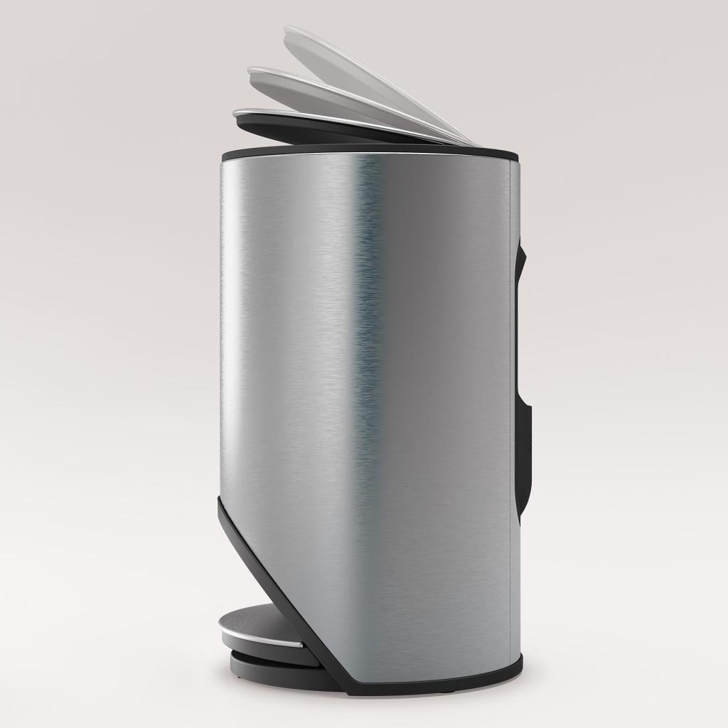 - Kompaktní kulatý tvar byl navržen tak, aby pedál zapadl přímo do půdorysu koše a nezabíral další místo na podlaze.