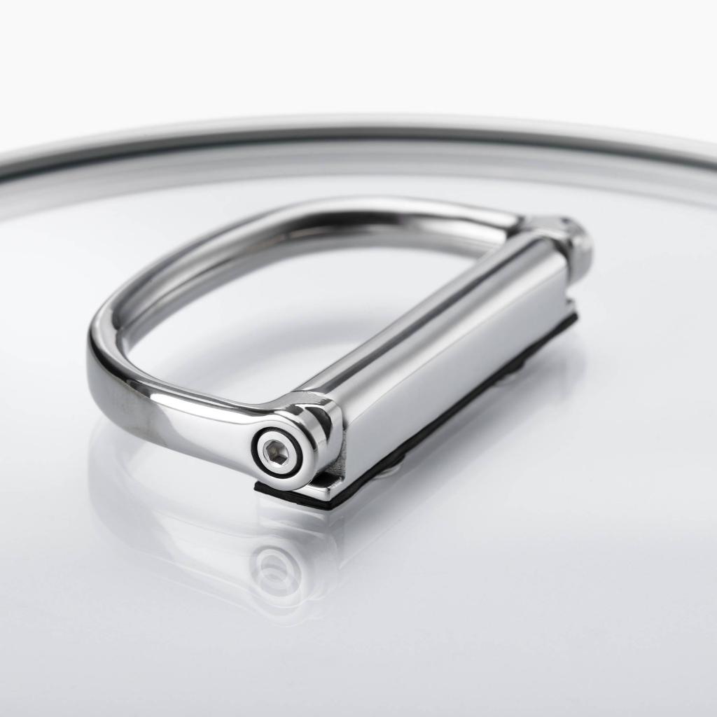 - Součástí je poklice z tvrzeného skla s nerezovým okrajem a sklopným nerezovým úchytem pro ještě úspornější uložení.