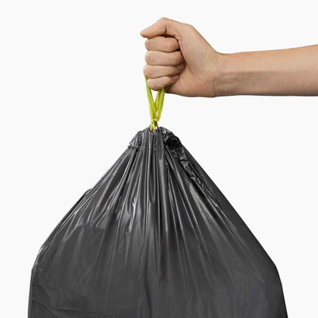 - Praktické stahovací šňůrky umožňují rychlé a hygienické uzavření pytle bez složité manipulace při jeho vyjímání z koše.