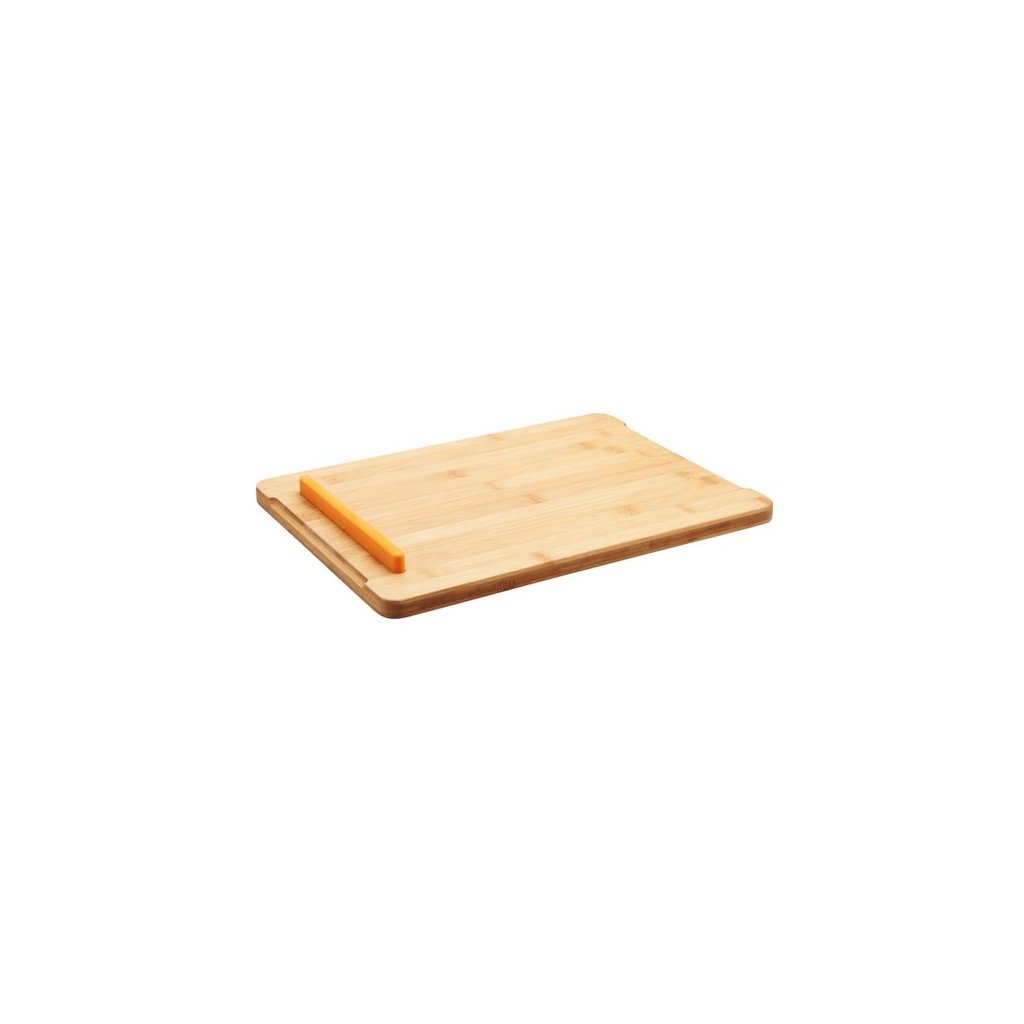 Ploché bambusové krájecí prkénko je ideální pro přípravu zeleniny, ovoce, bylinek, masa a pro krájení, aranžování a podávání sýrů a klobás. Má protiskluzové silikonové nožičky a integrovanou silikonovou zarážku na vrchní straně prkénka pro stohování plastové desky a prkénka s drážkami. Zarážku lze také použít pro bezpečné očištění čepele nože a setření odřezků z povrchu prkénka.
