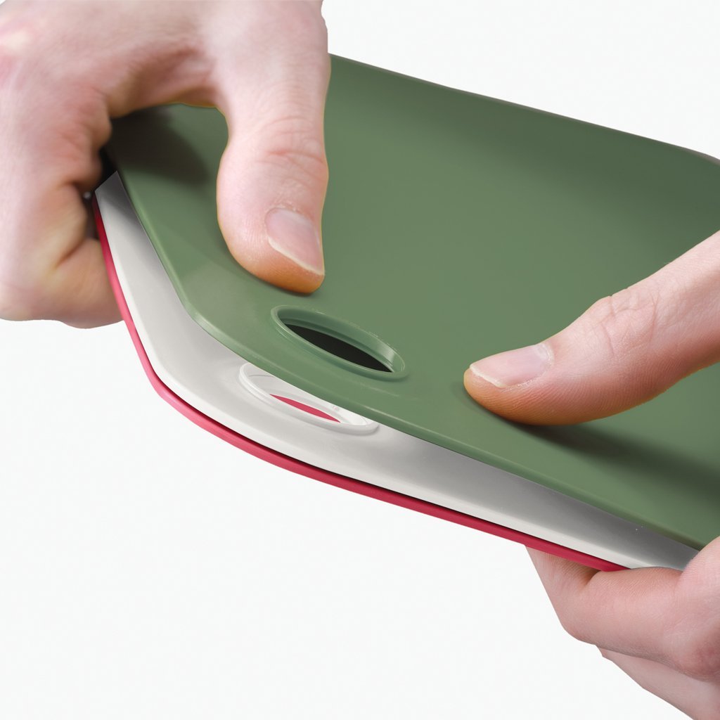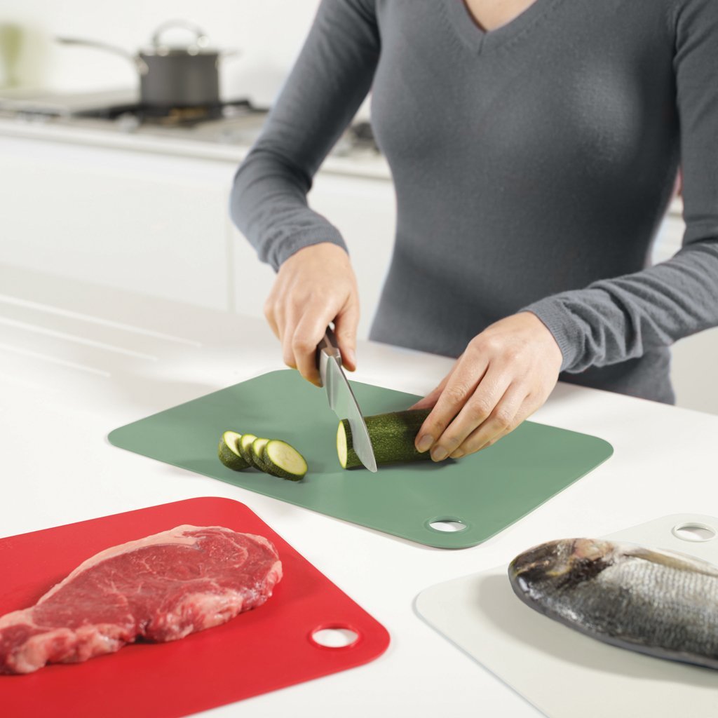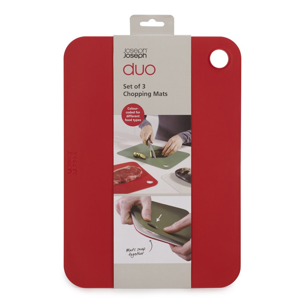 Sada 3 plastových krájecích podložek JOSEPH JOSEPH Duo pro oddělené krájení zeleniny, masa a vařených potravin. Otvor je tvarován jako klip umožňující spojení podložek k sobě nebo zavěšení. Každá podložka má jinou barvu, abyste je mohli snadno odlišit. Podložky byly speciálně vytvořeny, aby uchovaly kondici vašich nožů, a aby bylo krájení potravin maximálně bezpečné a hygienické. Jsou vhodné do myčky na nádobí.