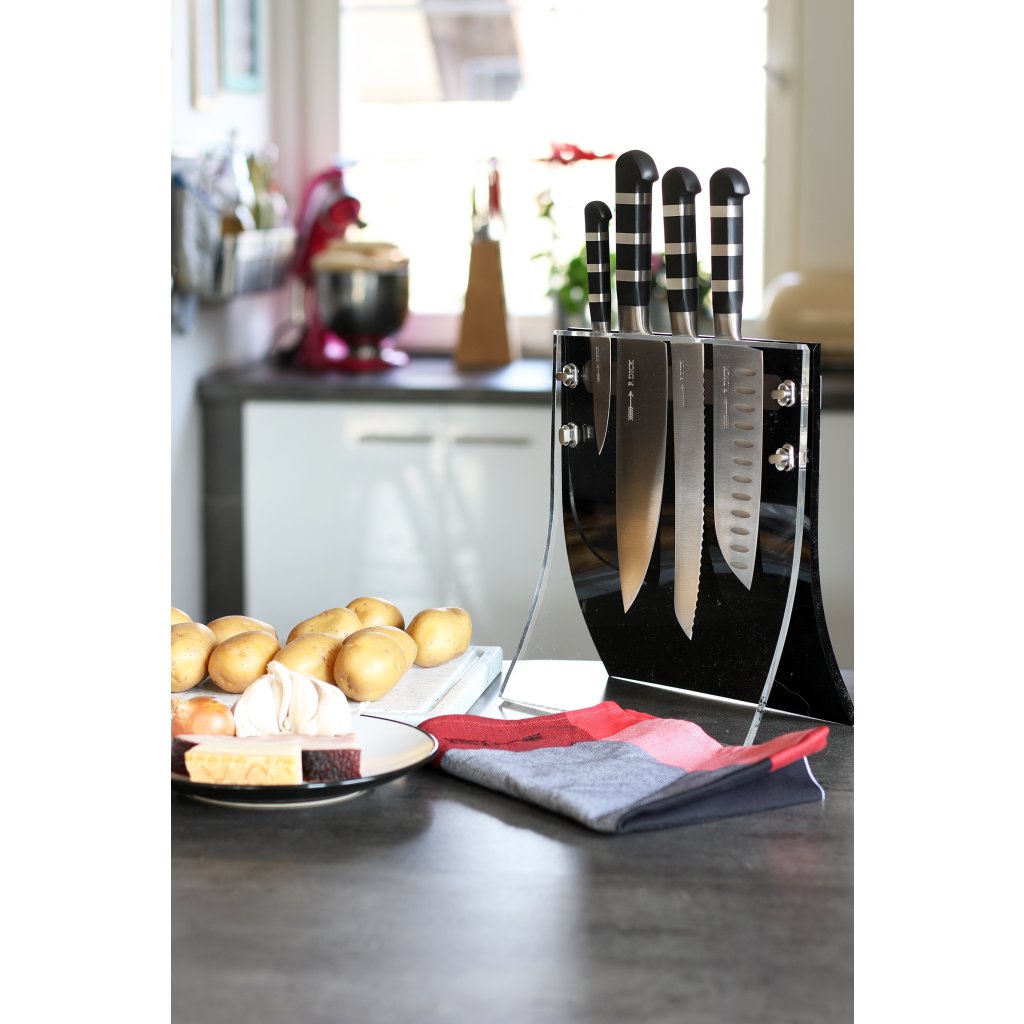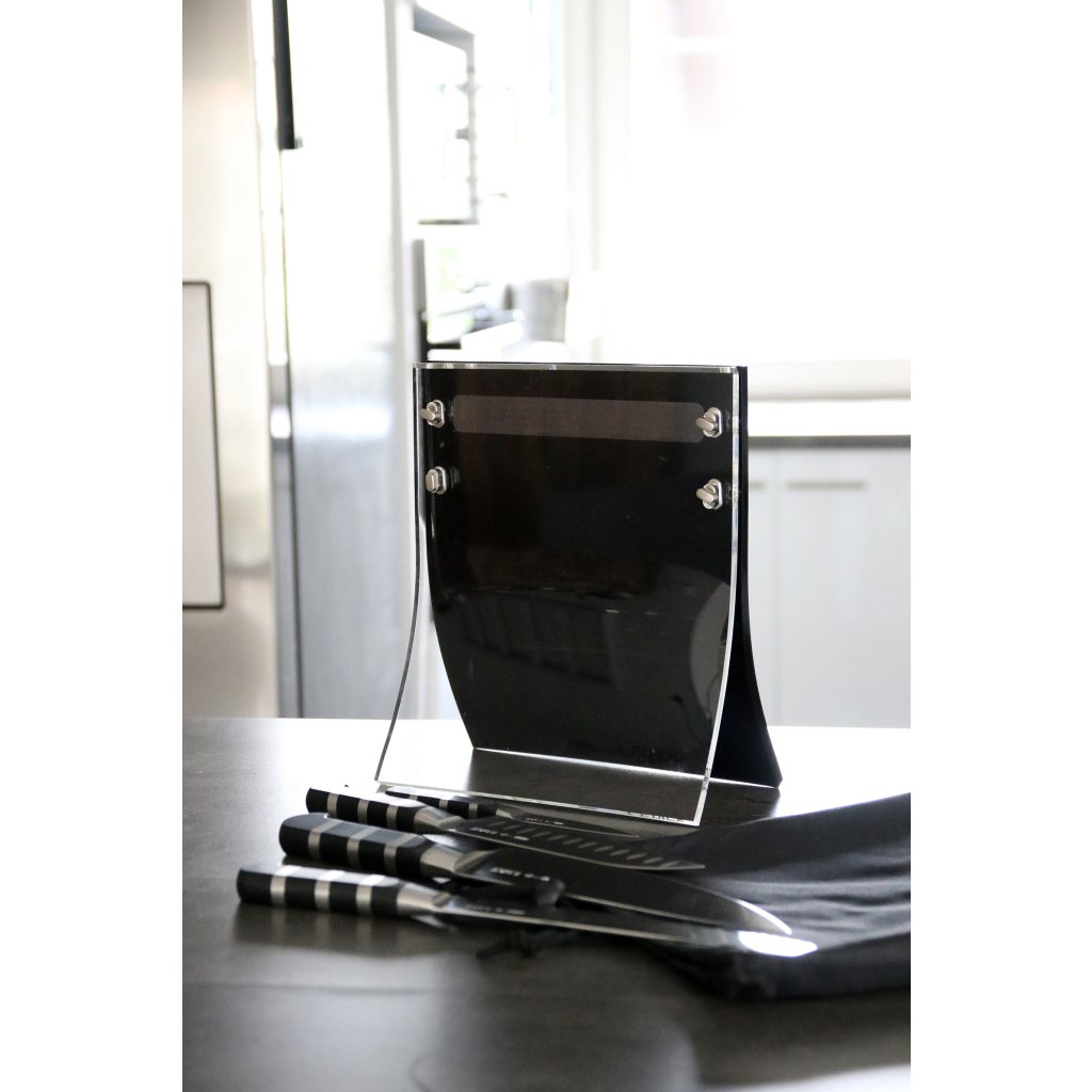 Magnetický stojan Dick na nože se skládá se ze dvou částí, mezi které nože zasouváte. Zadní tmavá část má magnetickou lištu, na které nože drží. Přední průhledná akrylová část plní především bezpečností úlohu, aby se při práci někdo o nože nezranil. Lze ji kdykoliv oddělit díky 4 otáčecím šroubům. Na nože vidíte, takže vždy bezpečně sáhnete pro ten, který potřebujete, a zároveň jsou nože bezpečně uloženy například před dětmi.
