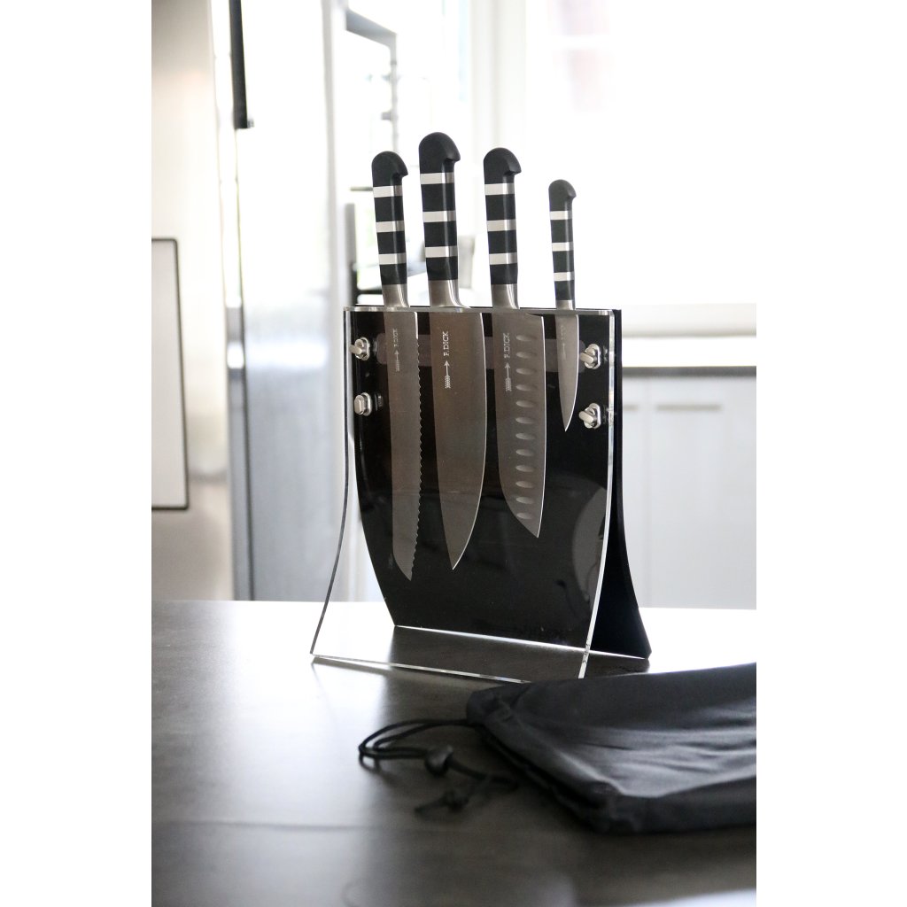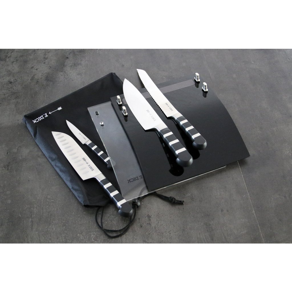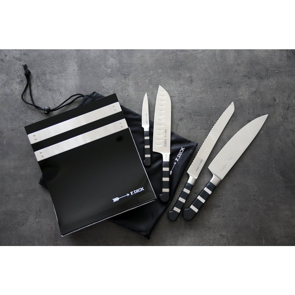 Magnetický stojan Dick na nože s kovanými noži ze série 1905 je vhodný jako startovní sada do domácnosti nebo jako dárek. Tato sada obsahuje: Kuchařský nůž v délce 21 cm, nůž Santoku se speciálním výbrusem v délce 18 cm, nůž na pečivo s vlnitým výbrusem v délce 21 cm a okrajovací nůž v délce 9 cm.