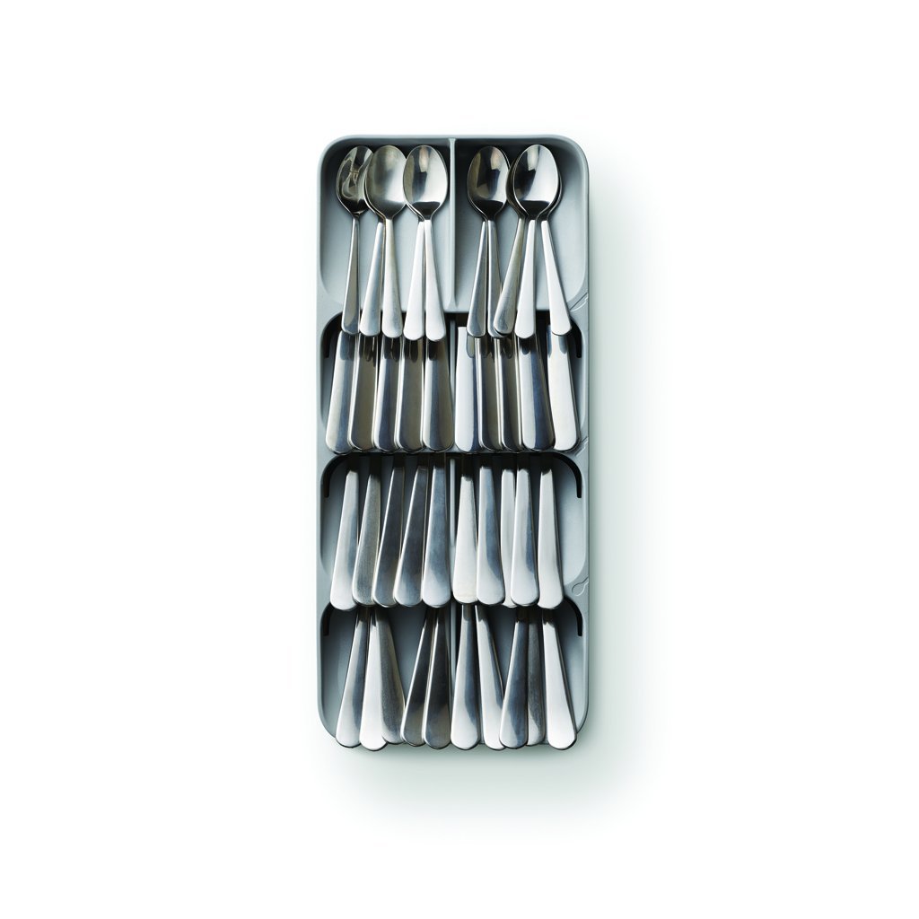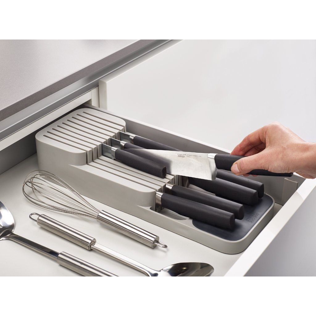 Sada organizérů do zásuvek DrawerStore - široký organizér na příbory a organizér na ukládání nožů. Ukládání příborů pod úhlem nad sebou v příborníku JOSEPH JOSEPH DrawerStore ušetří více než polovinu místa v zásuvce. Příbory můžete vkládat do označených slotů oboustranně. Dvoupatrový organizér JOSEPH JOSEPH DrawerStore k bezpečnému a praktickému uskladnění nožů v zásuvce - vhodný pro nože s délkou čepele až 23 cm a do zásuvky o minimální hloubce 7,5 cm.