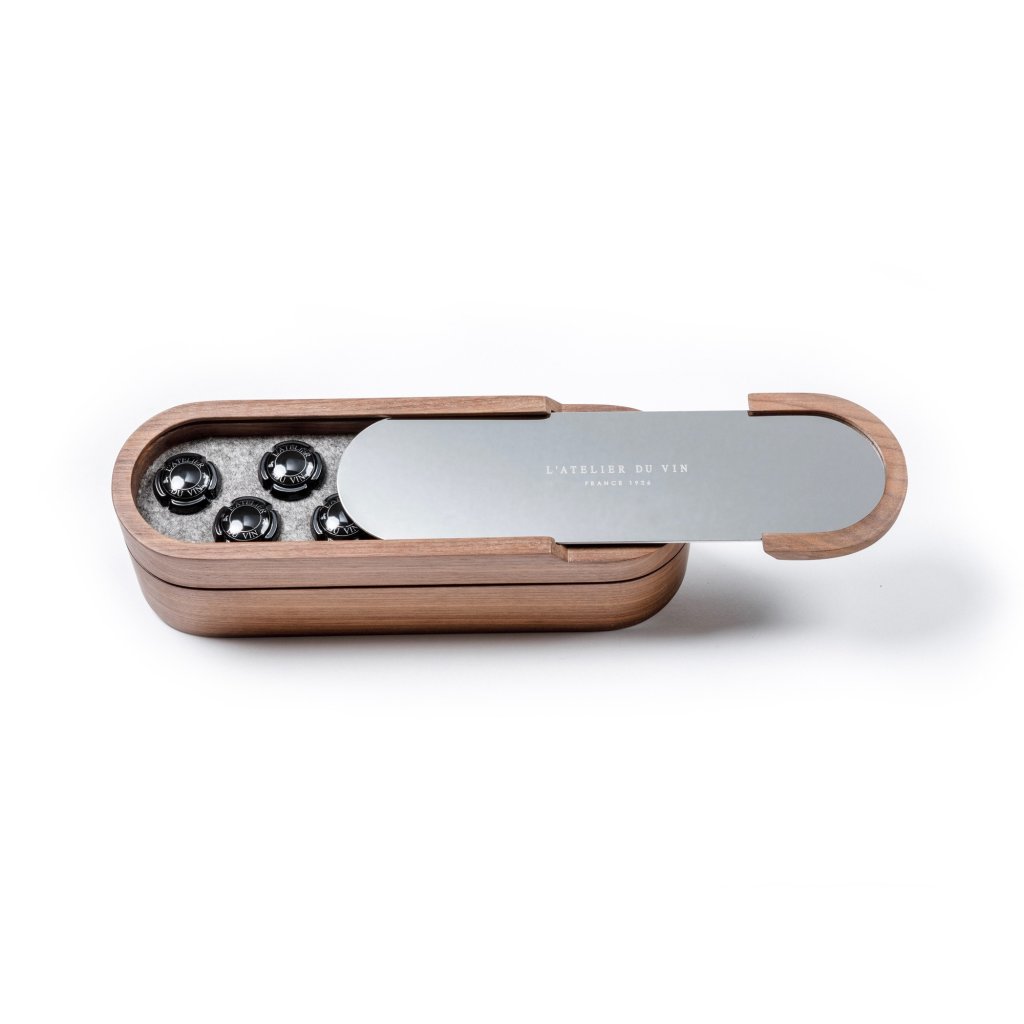 - sada základních nástrojů pro otevírání a uchovávání šumivých vín v luxusním boxu s tajnou přihrádkou