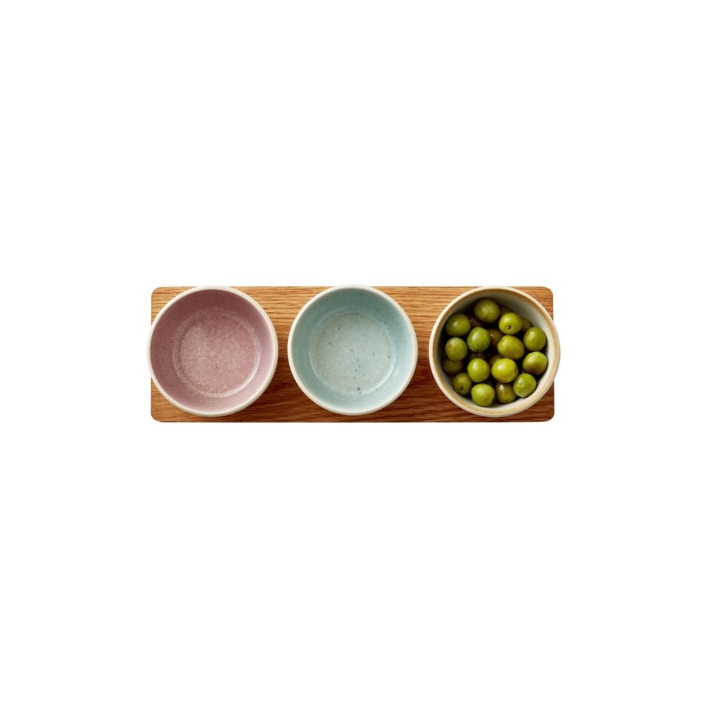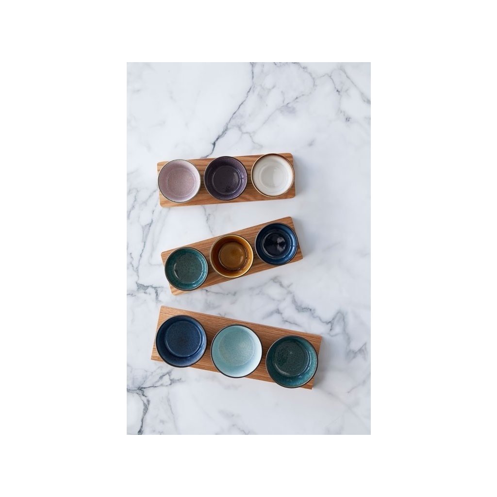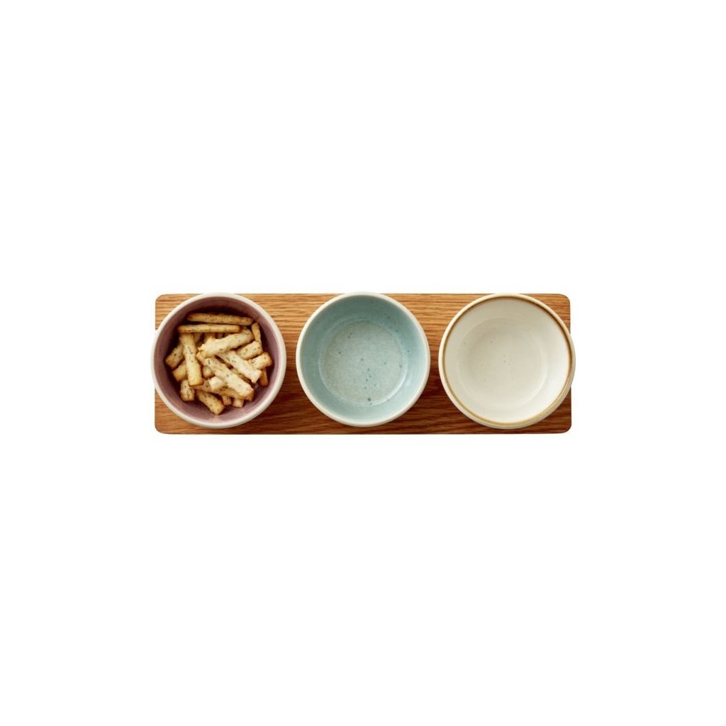 Servírovací misky o průměru 10 cm od společnosti Bitz jsou ideální pro servírování různých dipů, oliv apod. Jsou vyrobeny z kameniny, na vnitřní straně se pyšní lesklou barevnou glazurou a na vnější zase matnou reaktivní glazurou. Ta je vytvářena ručně, takže každá miska je originál. Misky vydrží myčku na nádobí, mikrovlnku, mrazničku do -18°C a troubu až 220°C. Dřevěný podnos je vyroben z dubového dřeva.