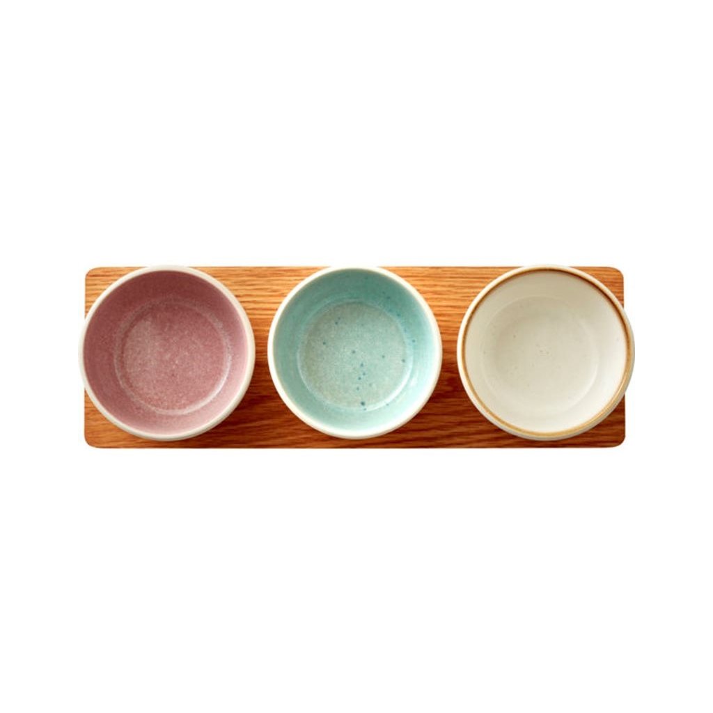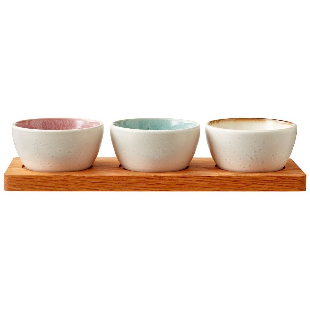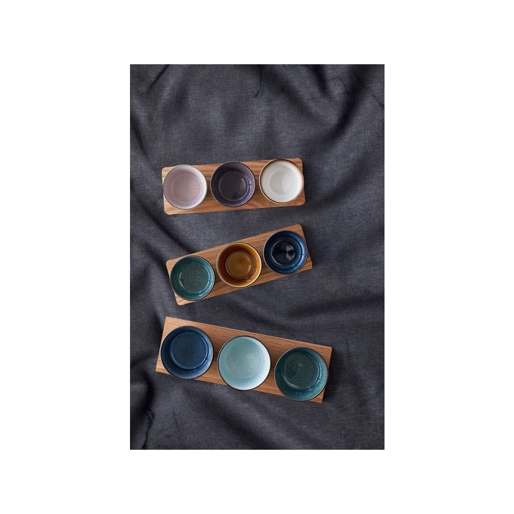 Servírovací misky o průměru 10 cm od společnosti Bitz jsou ideální pro servírování různých dipů, oliv apod. Jsou vyrobeny z kameniny, na vnitřní straně se pyšní lesklou barevnou glazurou a na vnější zase matnou reaktivní glazurou. Ta je vytvářena ručně, takže každá miska je originál. Misky vydrží myčku na nádobí, mikrovlnku, mrazničku do -18°C a troubu až 220°C. Dřevěný podnos je vyroben z dubového dřeva.