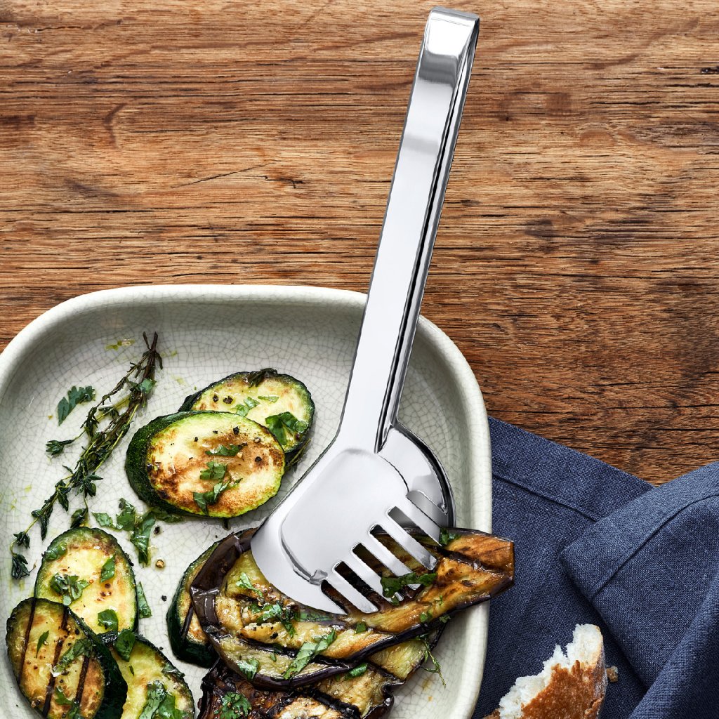 Servírovací kleště Bistro oceníte pro podávání celé řady pokrmů včetně šťavnatých kousků masa či pokrmů obsahujících marinádu. S jejich pomocí naberete vždy to správné množství salátu, plátek masové rolády či porci těstovin, aniž byste potřísnili krásně prostřený stůl. Jedna část kleští opatřená zuby zajistí pevný úchop, druhá, plná část, pak bezpečně zadrží nadbytečnou omáčku, dressing či vodu.