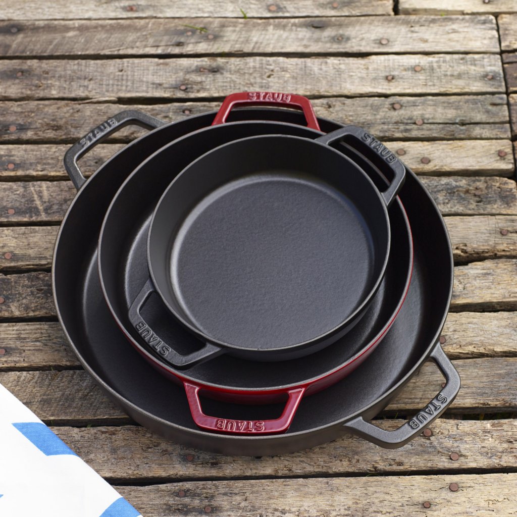 Servírovací litinová pánev ⌀ 26 Staub s hladkým smaltovaným dnem je vhodná na všechny typy varných zdrojů včetně indukce. Skvěle snáší vysoké teploty. Ať už pánev na smažení využijete na přípravu zeleniny, ryb, masa či na ohřátí předvařených jídel, s výsledkem budete vždy spokojeni.