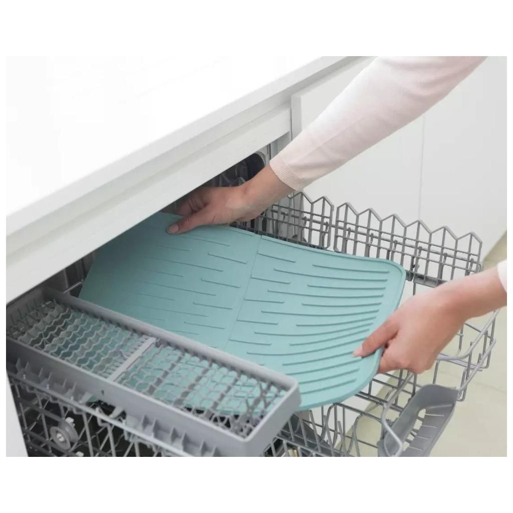 Silikonový odkapávač na nádobí s protiskluzovým povrchem, vhodný pro talíře, hrnky i křehké sklo. Voda z kapajících nádobí vede přímo do dřezu, takže pracovní deska zůstává suchá. Snadná údržba, možno mýt v myčce nádobí.