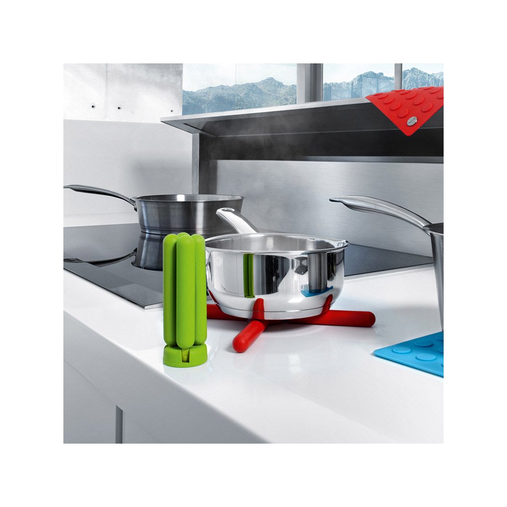 Skládací podložka pod hrnec KNIK chrání stůl před působením tepla a před nechtěnými škrábanci. Složená pak šetří místo. Můžete ji uložit do šuplíku nebo postavit na kuchyňskou linku. Díky použití odolného silikonu se nemusíte bát odkládat na ni horké pánve nebo hrnce, silikon neroztaje. Navíc je dostatečně velká pro nádobí v domácnosti běžně používané.