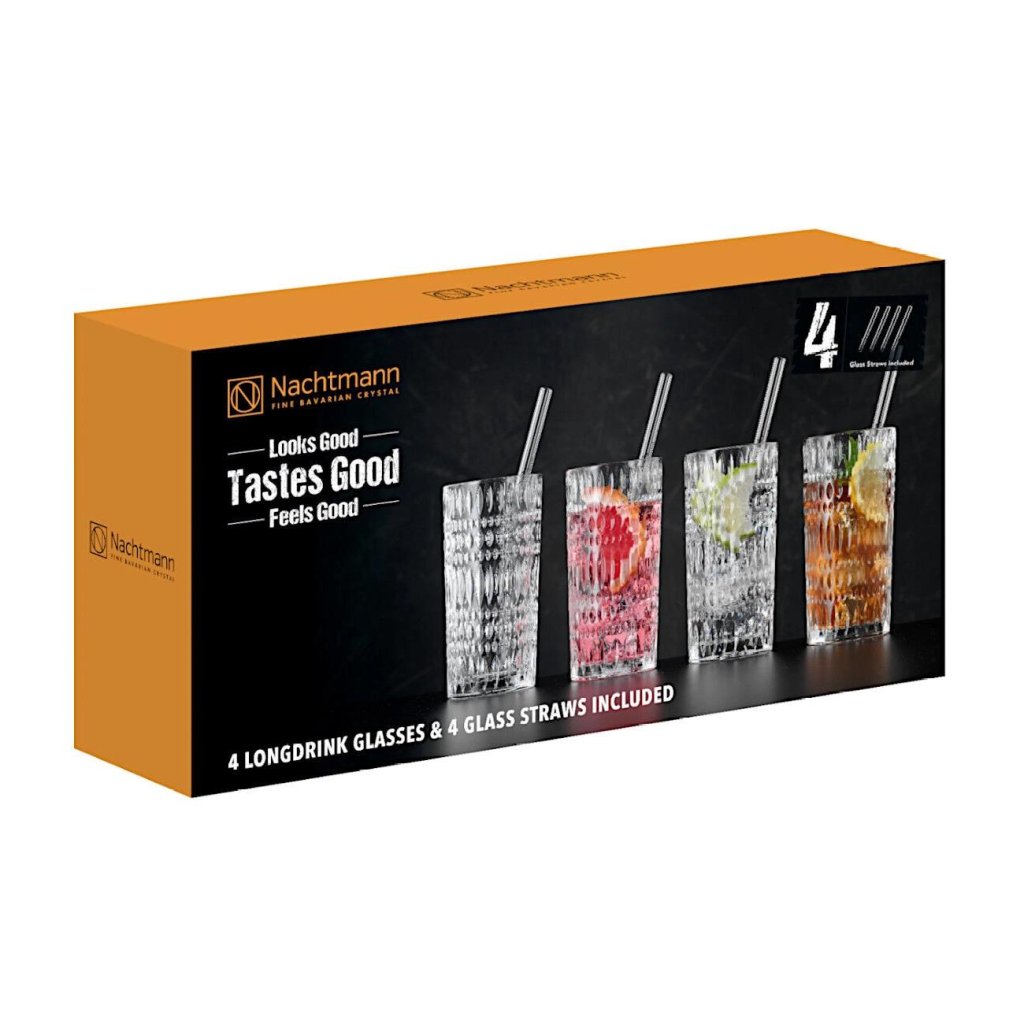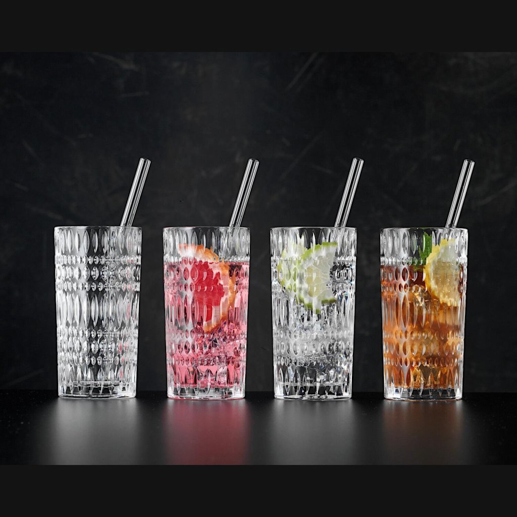 - Sada 4 sklenic na long drink a čtyř skleněných brček představuje moderní řešení pro stylové servírování vody, džusů, limonád i klasických drinků během běžných dnů i společenských příležitostí.