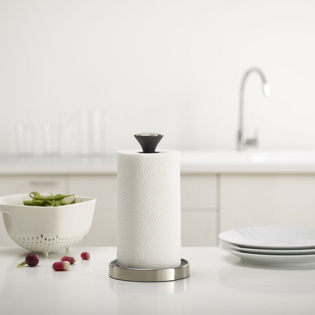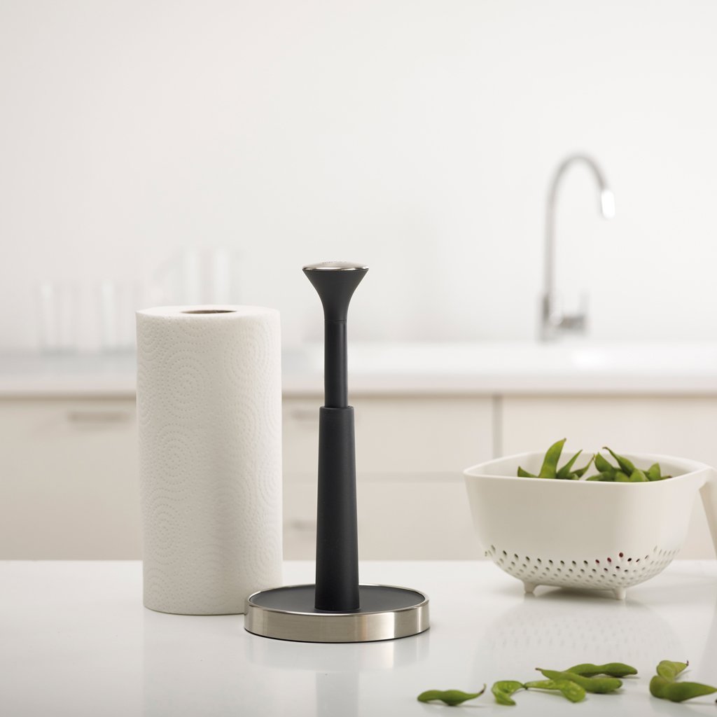 Stojan na role papírových utěrek JOSEPH JOSEPH Push&Tear má pružinovou hlavici, jejímž stiskem zablokujete otáčení role při odtrhávání. Máte-li špinavé ruce, umožňuje nerezová hlavice i stisk zápěstím nebo předloktím. Zvednutý okraj základny stojanu zabraňuje samovolnému odvíjení papíru. Spodní strana stojanu má protiskluznou úpravu. Nové role se nasazují po vyjmutí hlavice. Stojan je vhodný pro papírové role do výšky 24 cm.