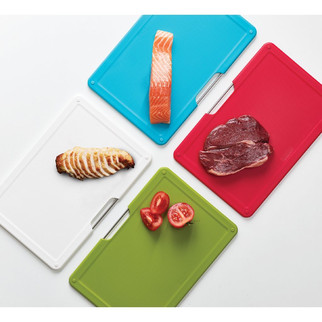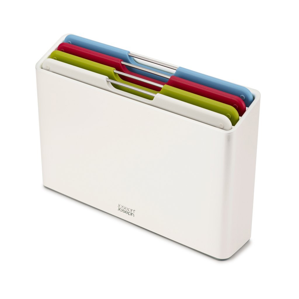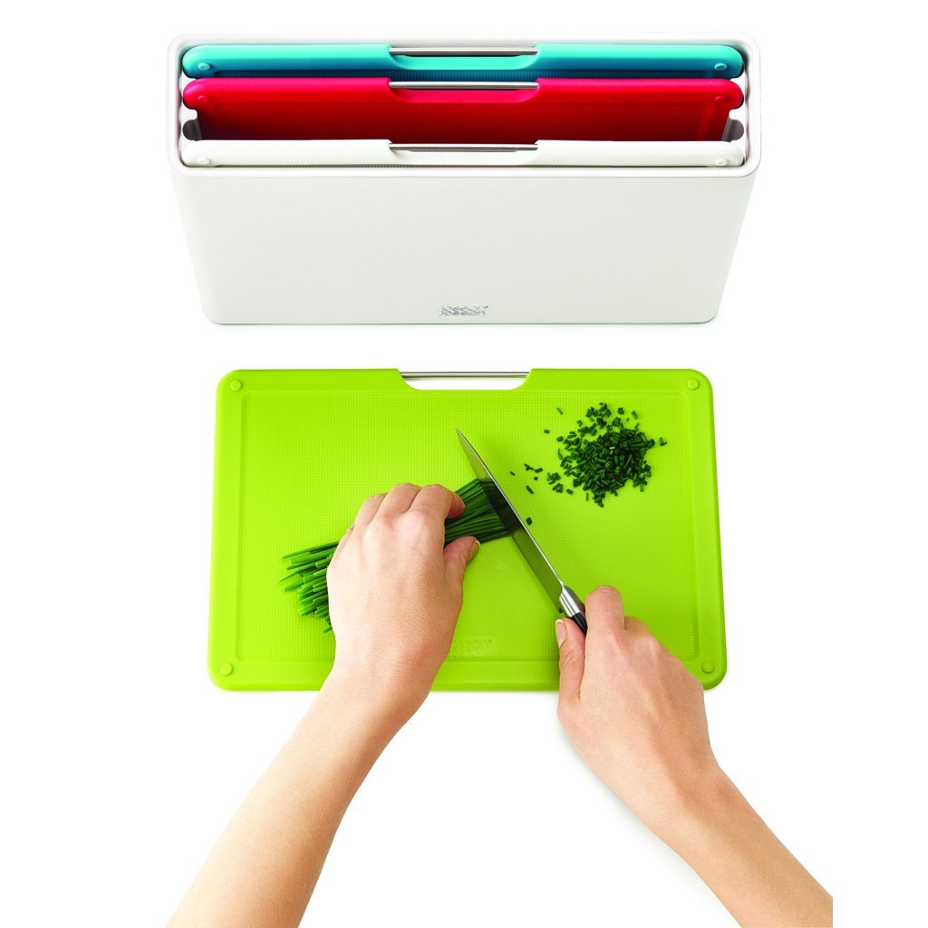 Silnou stránkou plastových krájecích prkének je rozhodně jejich snadná údržba, hygieničnost a především to, že jsou citlivé k našim nožům. Cílem designérů značky Joseph Joseph tentokrát bylo poskytnout prkénka k ruce na pracovní desku, vyrobit unikátní prkénka pro plnění účelu na 100 %, a také vyřešit jejich elegantní uložení. Stojan s prkénky Folio je sadou pro nejčastější práce v kuchyni.