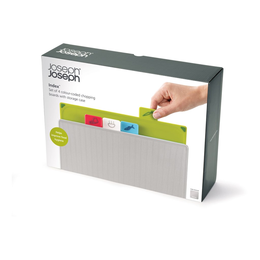 Silnou stránkou plastových krájecích prkének je rozhodně jejich snadná údržba, hygieničnost a předvším to, že jsou citlivé k našim nožům. Cílem designérů tentokrát bylo poskytnout prkénka k ruce na pracovní desku, vyrobit unikátní prkénka pro plnění účelu na 100 % a také vyřešit jejich elegantní uložení. Stojan s prkénky Index je sadou pro nejčastější práce v kuchyni. Každé prkénko má svou unikátní barvu, svoje grafické značení.