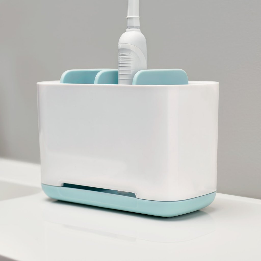 Hygiena musí být nejen v ústech, ale i v koupelně. Tento stojánek je proto rozdělen na jednotlivé prostory, v nichž snadno uložíte zubní kartáčky, pastu nebo dentální nit.