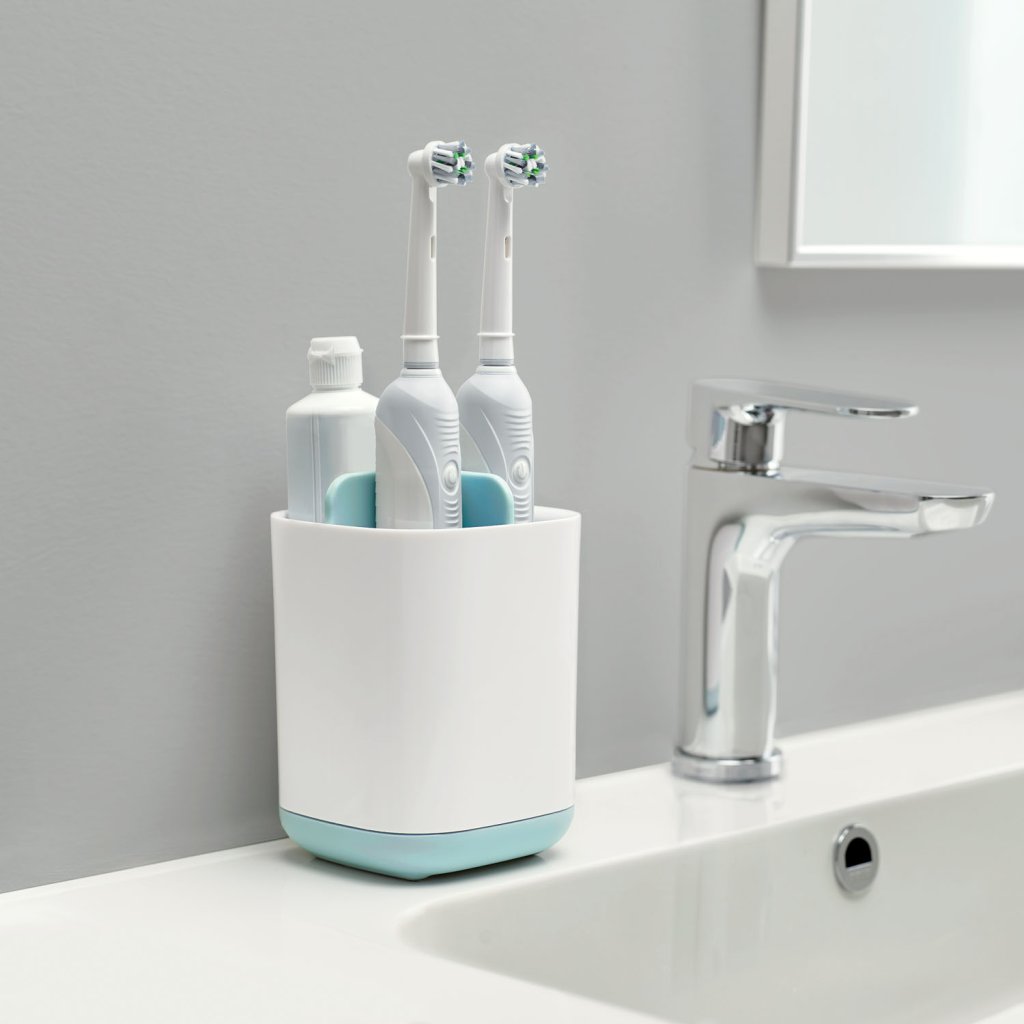 Hygiena musí být nejen v ústech, ale i v koupelně. Tento stojánek je proto rozdělen na jednotlivé prostory, v nichž snadno uložíte zubní kartáčky, pastu nebo dentální nit.