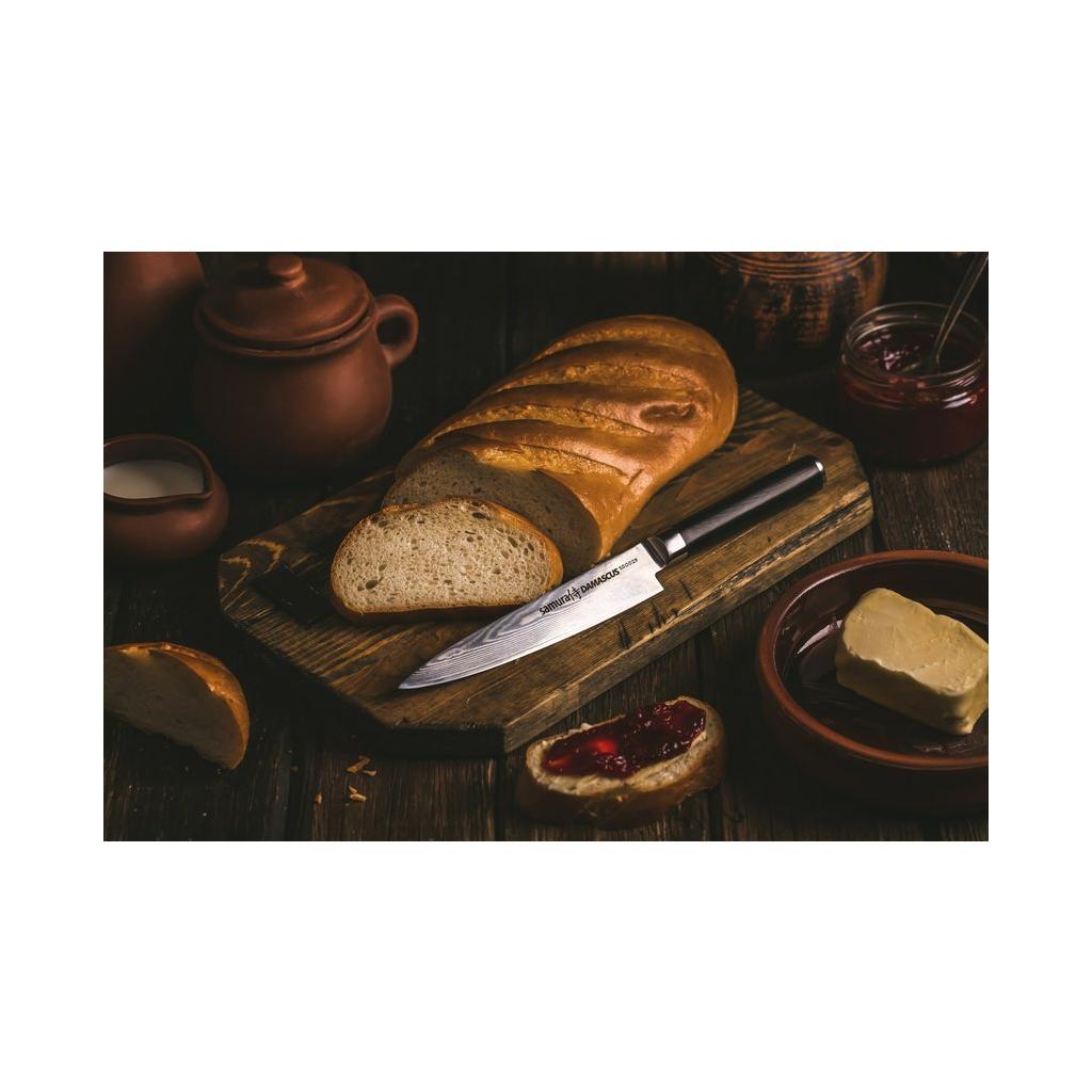Univerzální nůž Samura z produktové řady Damascus je jedním z nejžádanějších a nejvíce multifunkčních kuchyňských nožů pro krájení a loupání různých potravin. Tenká texturovaná čepel vyrobená z damaškové oceli vyniká mnoha skvělými schopnostmi a vlastnostmi tohoto jedinečného materiálu. Rukojeť je vyrobená z laminátu G-10, který nabízí ještě vyšší bezpečností standard než materiál mikarta. Univerzální nůž Damascus je velice populární. Je velmi lehký, ale zároveň tvrdý a odolný. Poskytuje pohodlné a příjemné krájení, s kvalitou a spolehlivostí nožů Samura osvědčené v každé kuchyni.