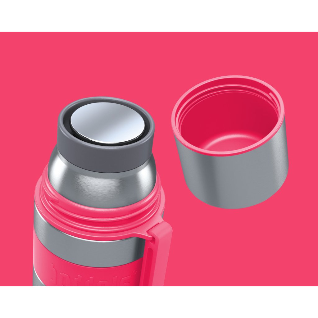 Vakuová termolahev značky Boddels je vyrobena z dvouplášťové nerezové oceli. Disponuje integrovaným hrnkem. Nápoj udrží teplý po dobu 12 hodin a chladný po dobu 24 hodin. Možnost pití a nalévání z jakékoliv strany díky 360° systému. Kolem termosky je silikonový, protiskluzový, barevný prsten.